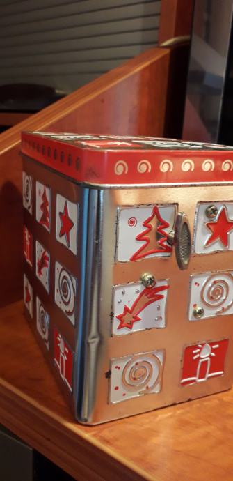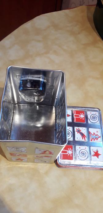 limena kutija za bombone ili kekse u dobrom stanju, u kutiji postoji mehanizam koji se navija i svira
