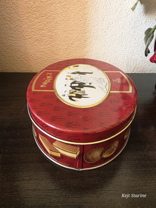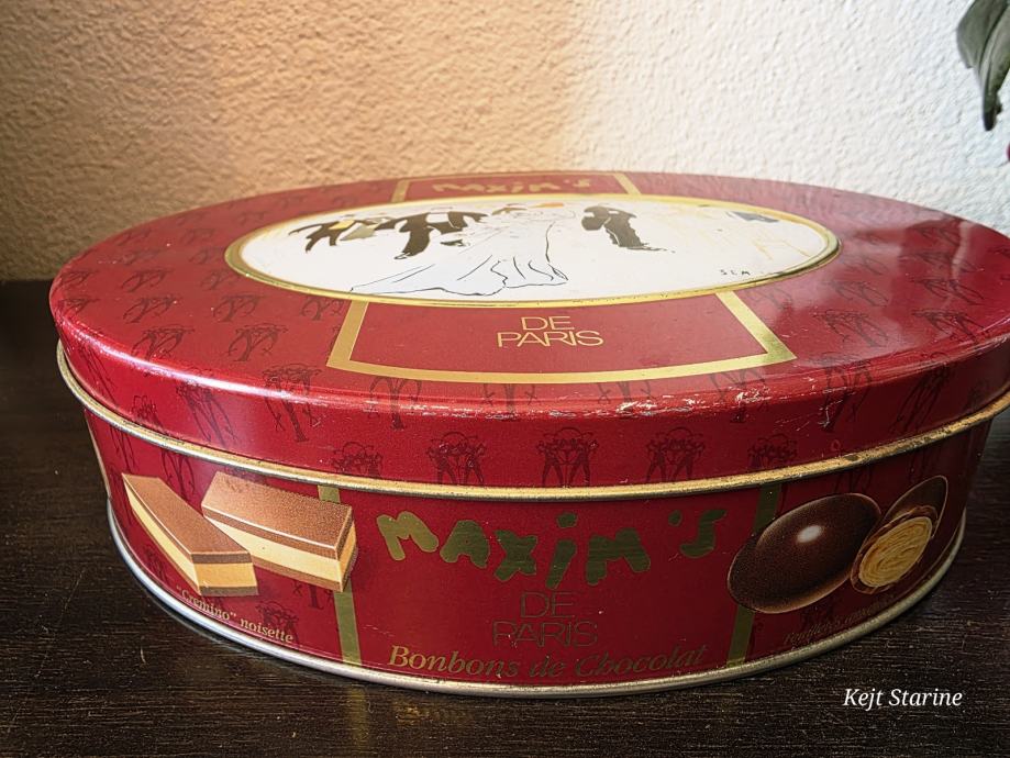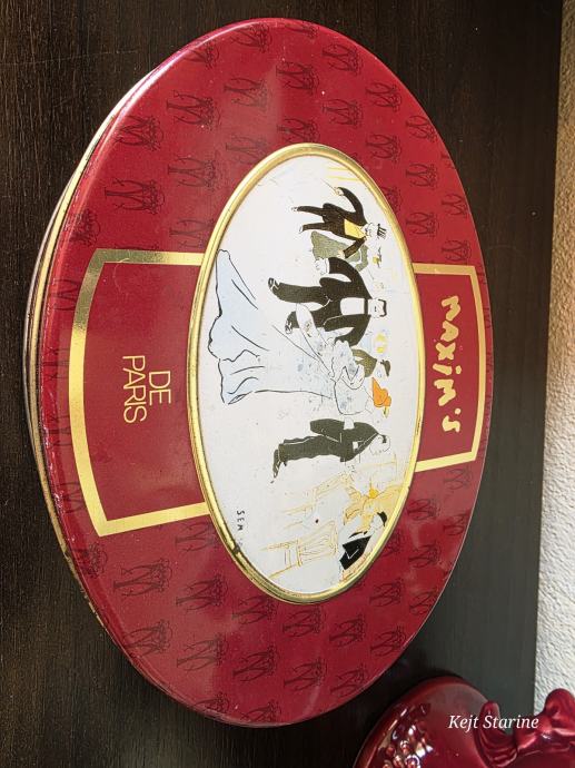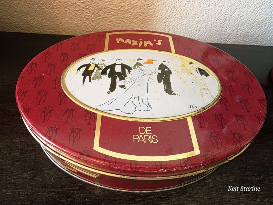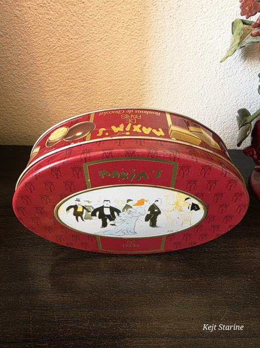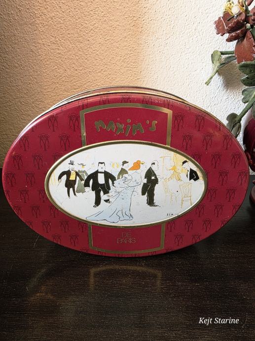 Limena kutija, MAXIM'S Of PARIS . Prikazana ovalna limena kutija je kolekcionarski predmet povezan s restoranom Maxim's u Parizu, a ilustracija je djelo poznatog francuskog karikaturista Georgesa Goursata, poznatog pod pseudonimom "Sem". Slikar Georges Goursat, odnosno "Sem", bio je poznat po svojim karikaturama pariškog društva s početka 20. stoljeća, a njegovi radovi su često prikazivali scene iz pariških restorana i kabarea.