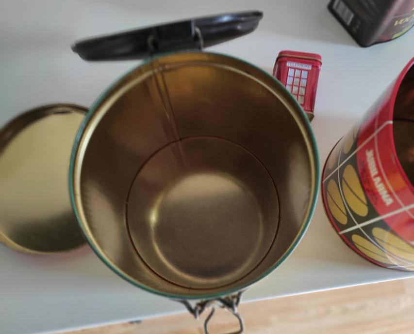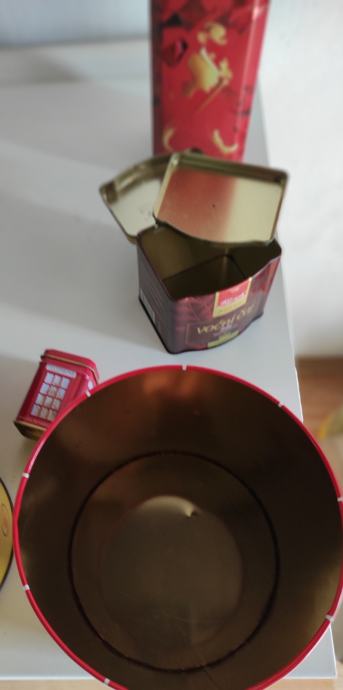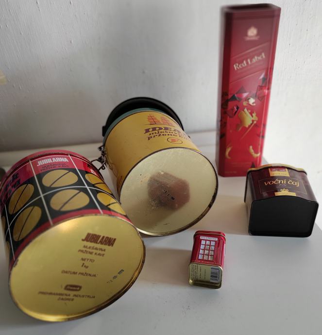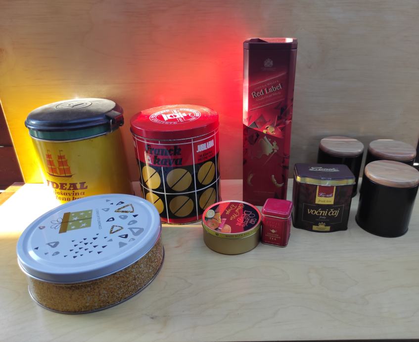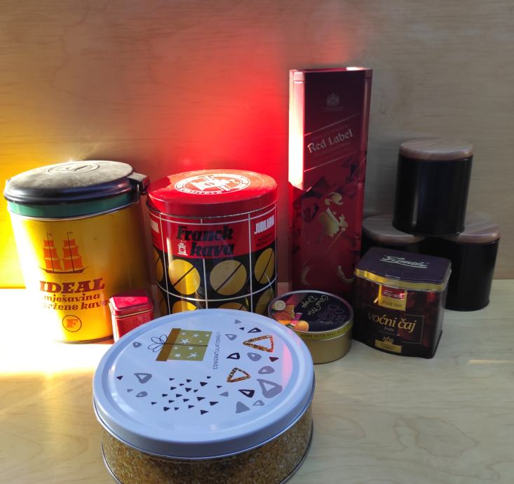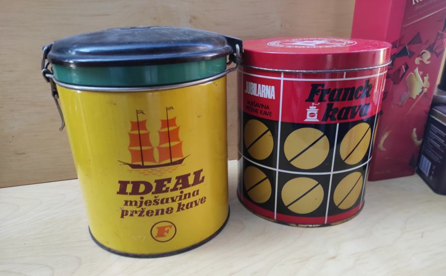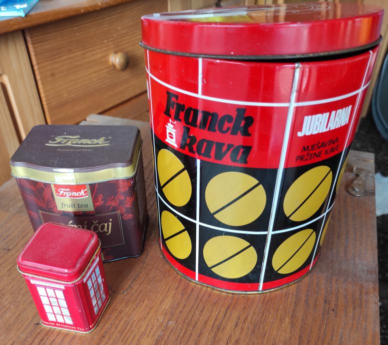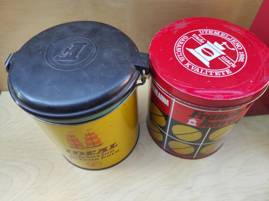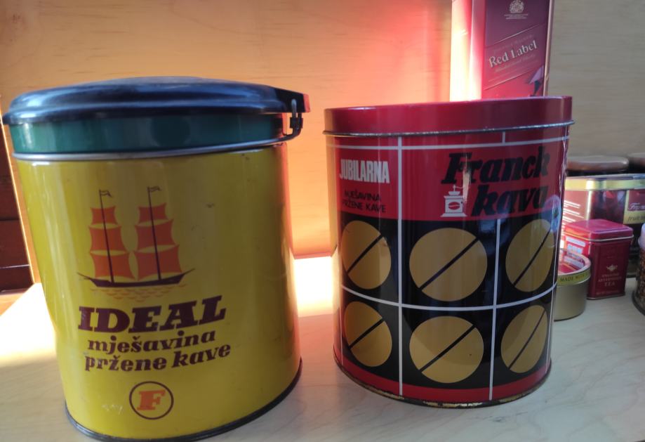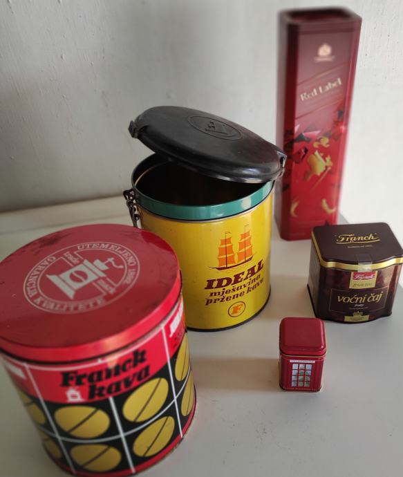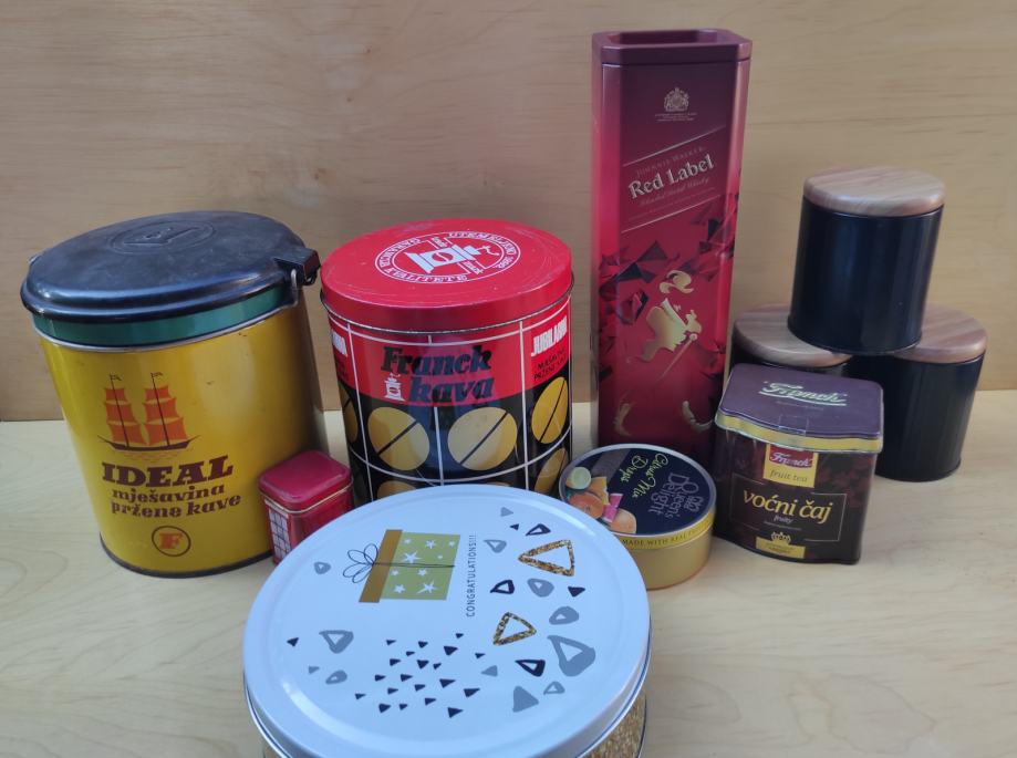 Limene kutije od kave, čajeva, viskija, Ideal Frank 1kg žuta sa poklopcem 20x15,5 / Frank crvena 1kg 15x18 iz 1976. god. , čaj London 6,5x4,3x4,3 / čaj Frank 9x8xv 9,5 / od bombona i danskih keksi i tri crne doze za šečer, sol i kavu cijena je za svih 10 komada, pogodno za dekoraciju u kafićima, kućama za odmor, filmske setove i sl.