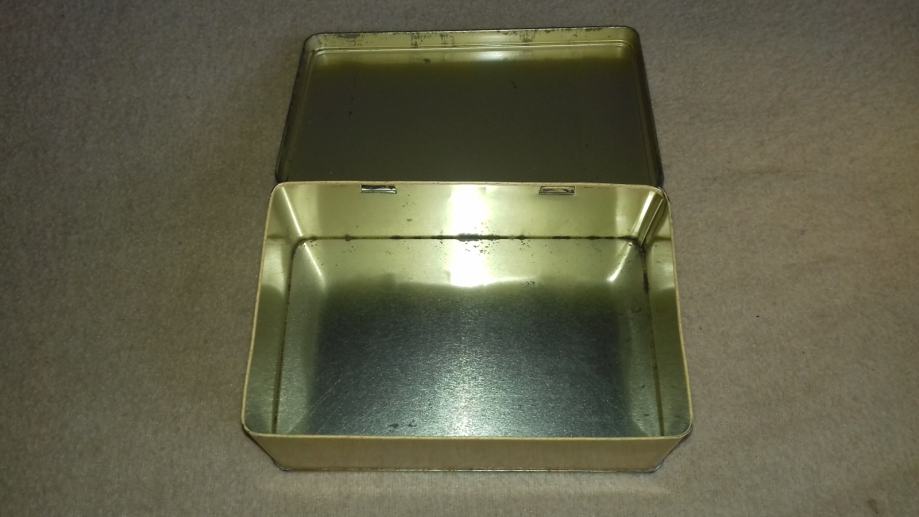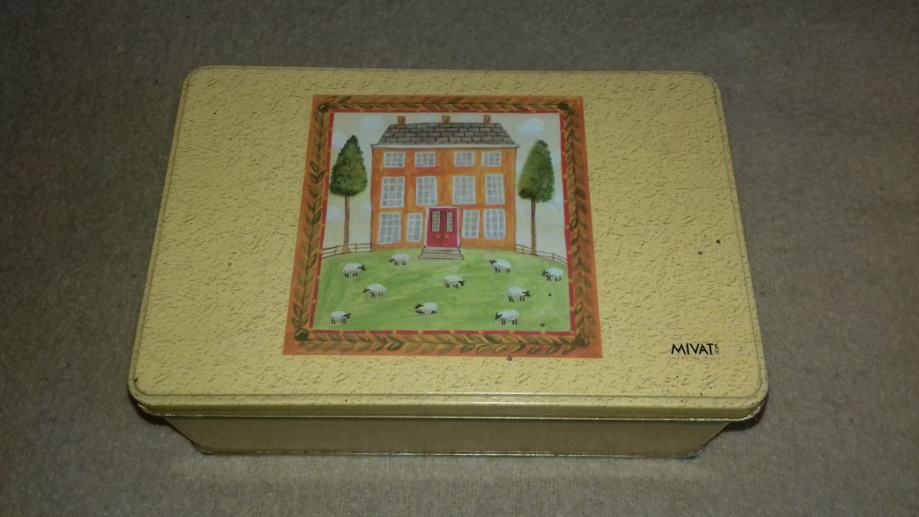 Metalna ukrasna kutija sa motivom kuće i ovaca, u dobrom stanju.