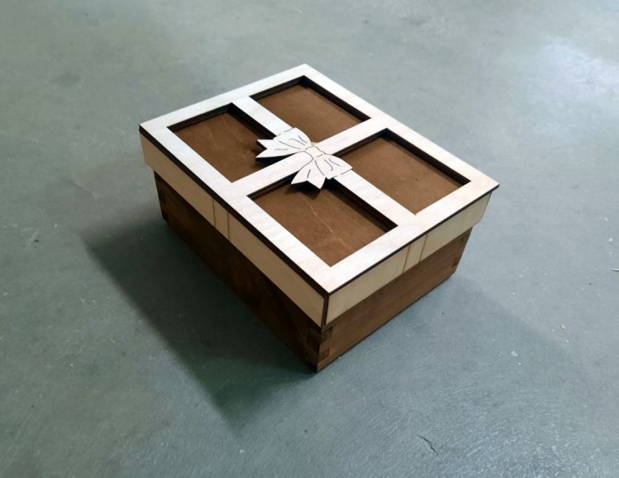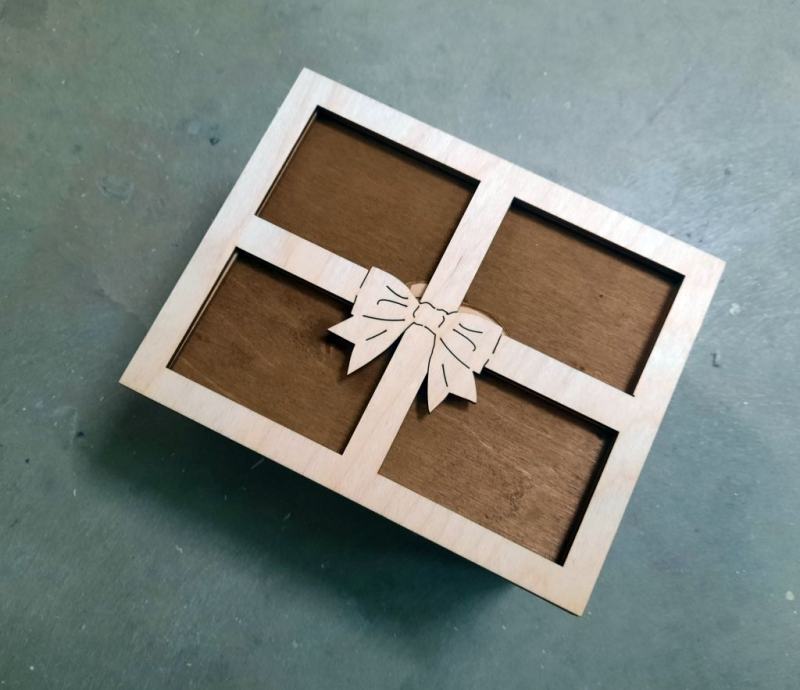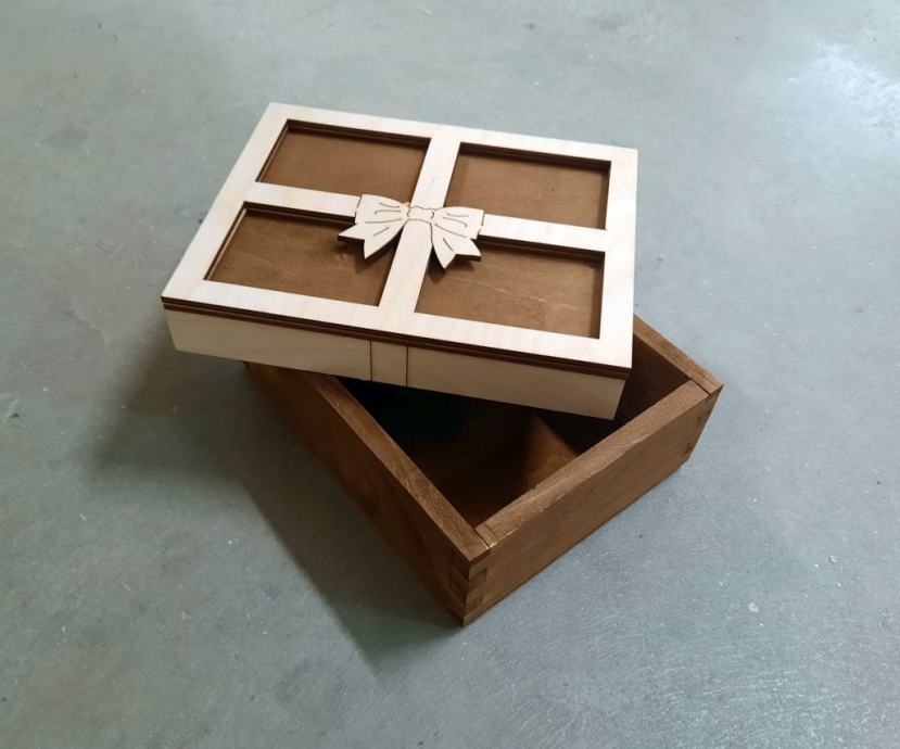 Drvena kutija u obliku poklona, ručno bajcano, sa drvenim ornamentima mašne i trake za pakiranje.