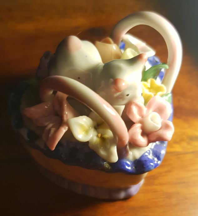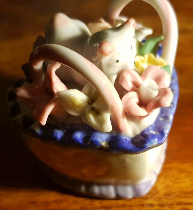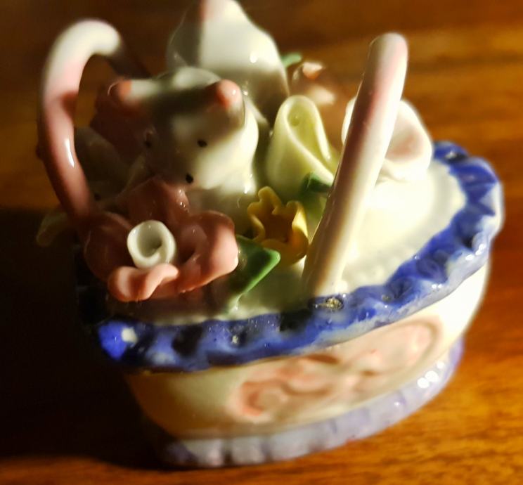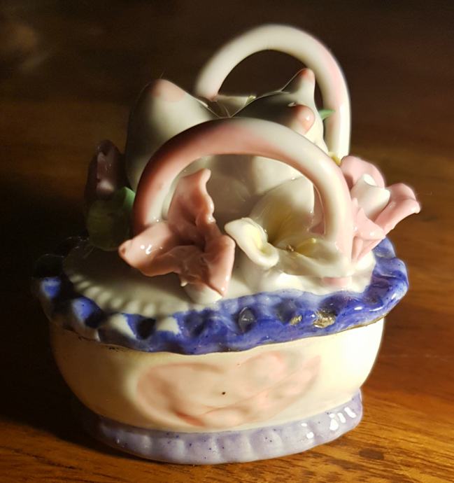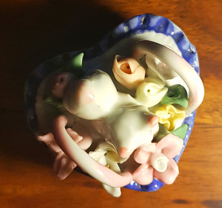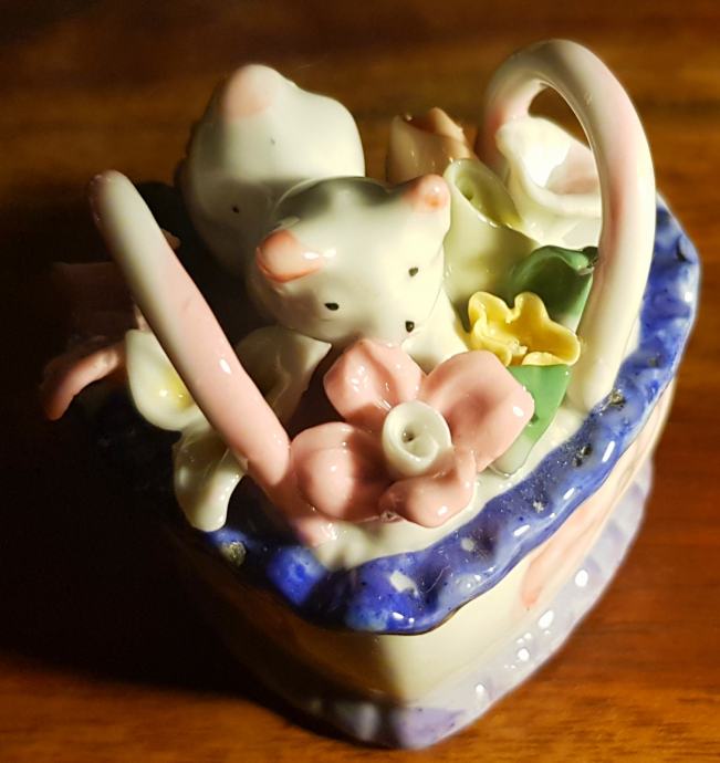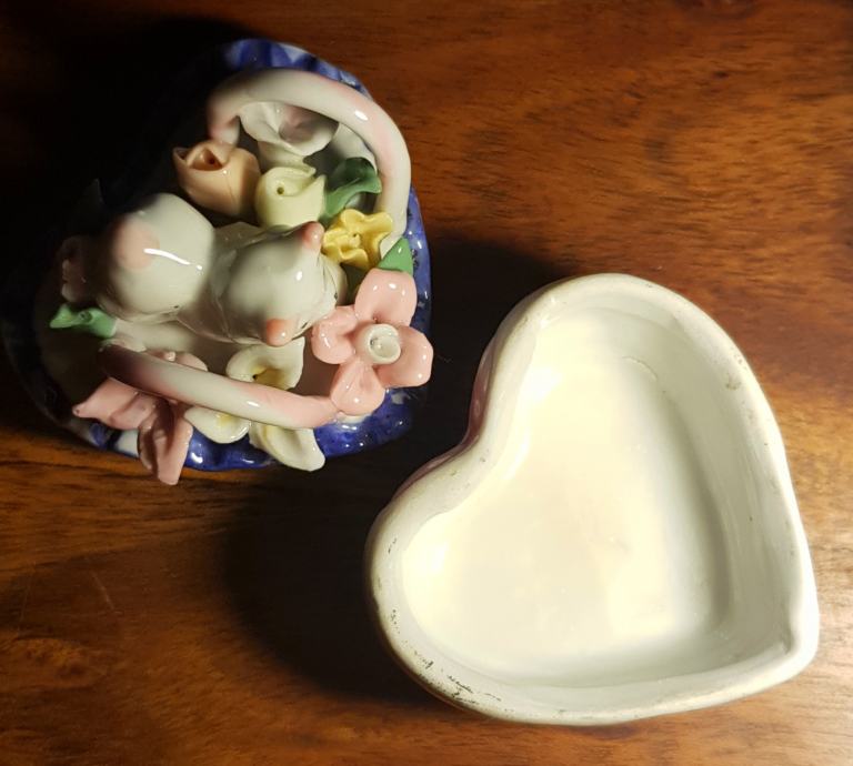 Ručno obojana posudica za nakit u obliku srca s malom mačkom i cvijećem na poklopcu, vjerojatno iz Njemačke.