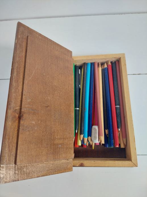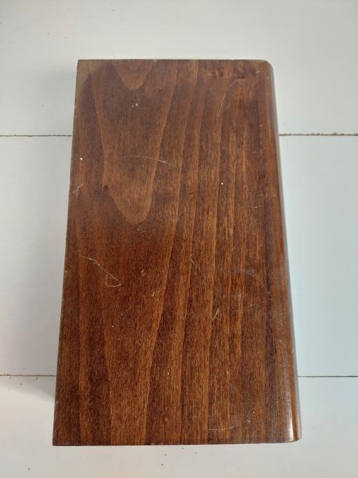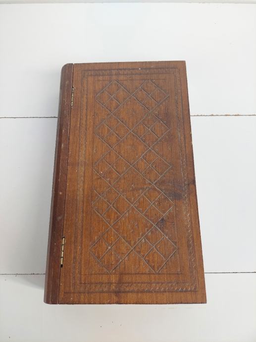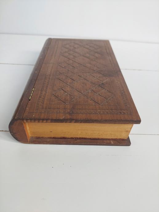 Starinska drvena kutija s poklopcem na preklop dužine 22 cm, širine 12,8 cm, visine 4,1 cm.