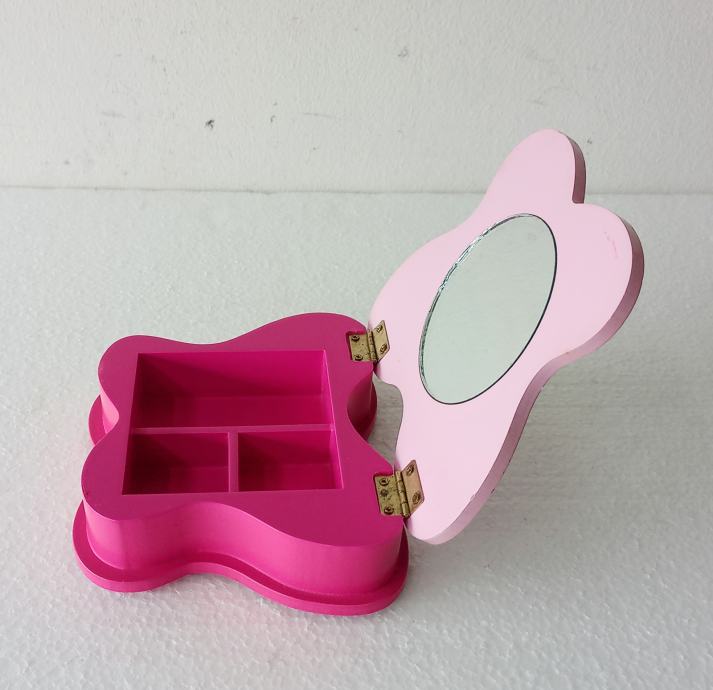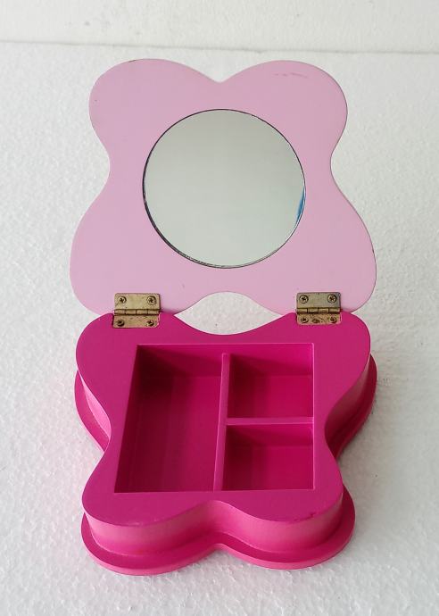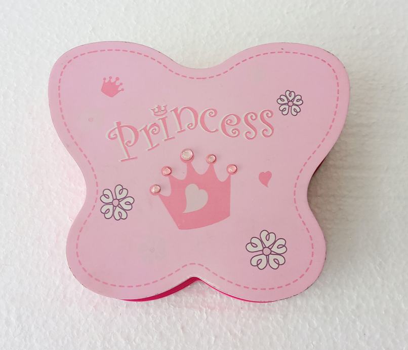 Princess ukrasna kutija za nakit (za djevojčice). Dimenzije 16,5×14 cm. Izrađena od drveta i ukrašena sa 5 perli na naslikanoj kruni. Iznutra dva mala i jedan veći pretinac za nakit. Ima i ogledalo.