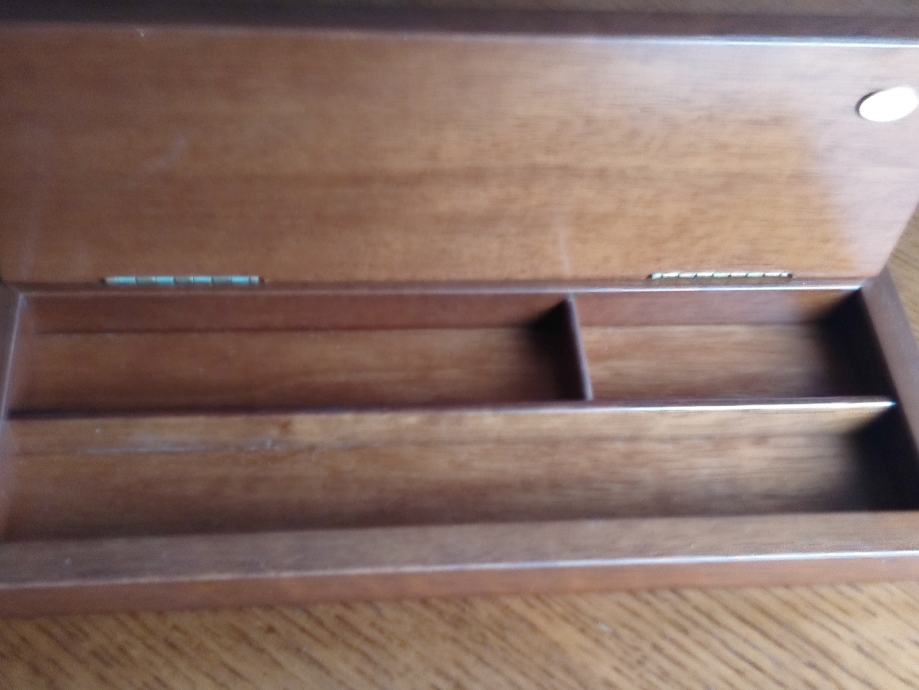 Lijepa kutija od kvalitetnog drva, s graviranim ukrasom na poklopcu, dužina 27 a širina 10 cm. Unutra je nekoliko pretinaca za pohranu cigara ili drugih predmeta; uz kutiju ide i futrola; vrlo lijep suvenir ili prigodan poklon