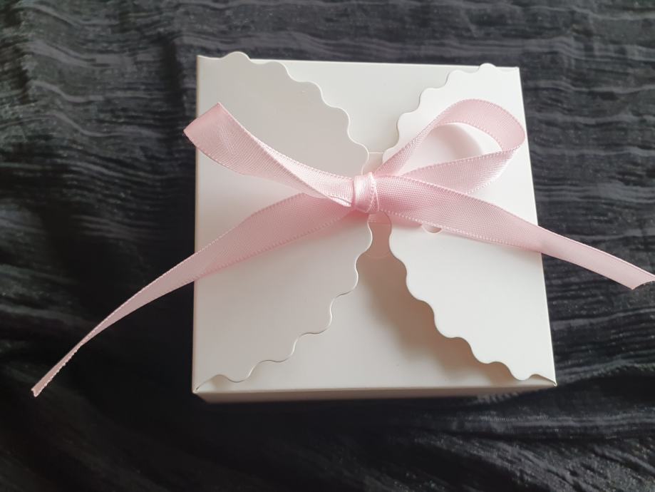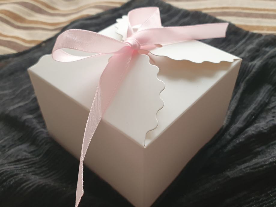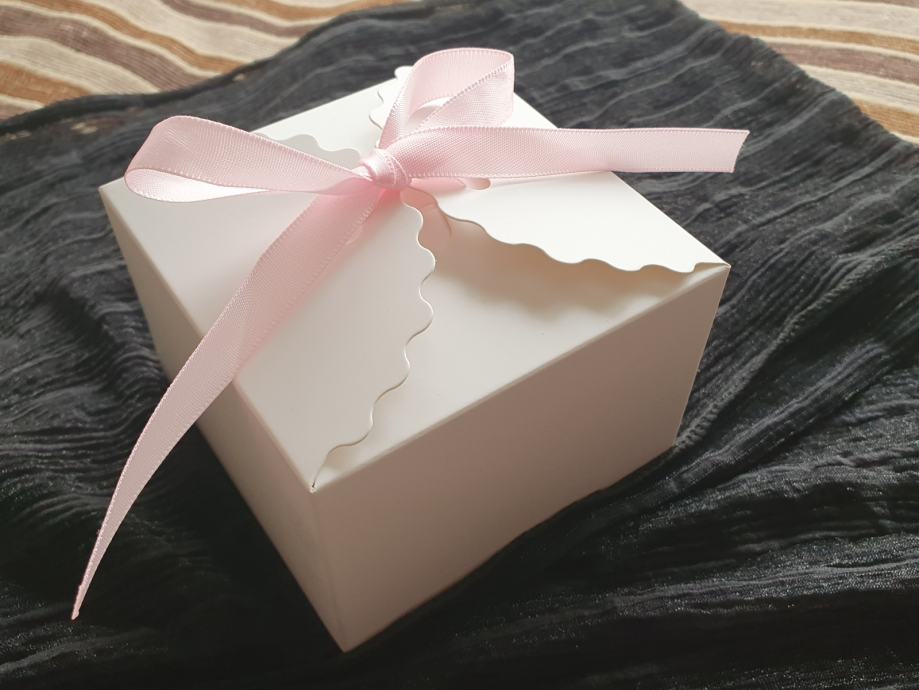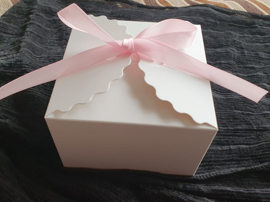 Ukrasna kutijica od kartona, sklopiva, sa mašnom, veličine 9 cm x 9 cm i visine 6 cm, bijele boje, prigodna za stavljanje poklona prigodom Prve pričesti, Krizme, vjenčanja, rođendana itd.