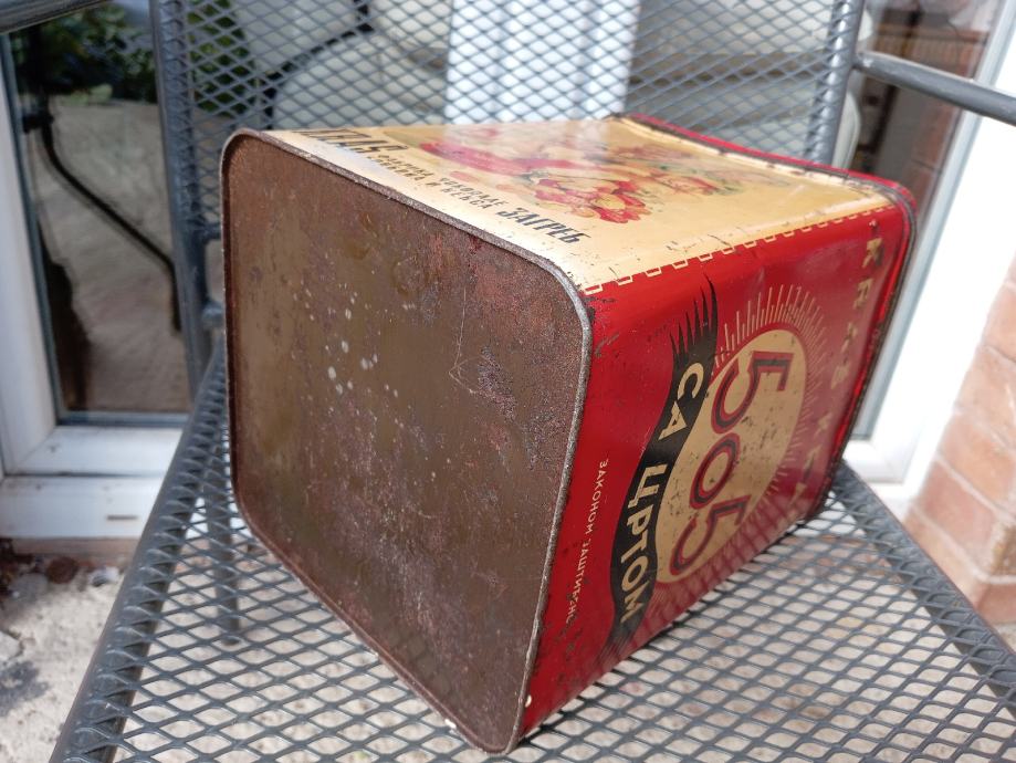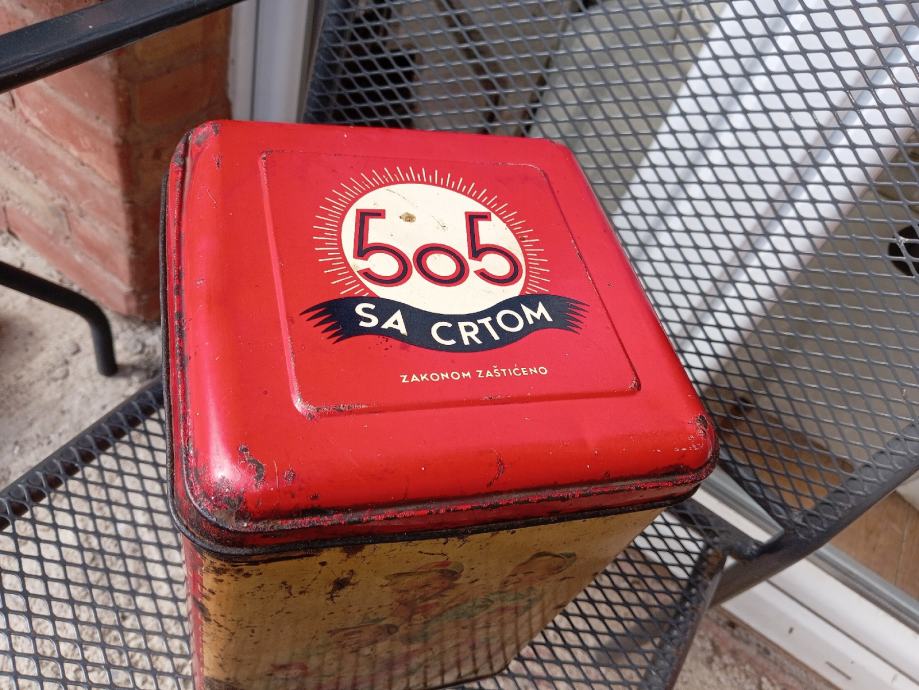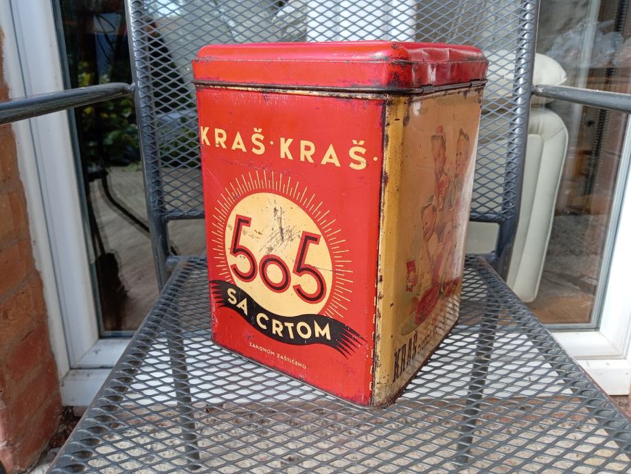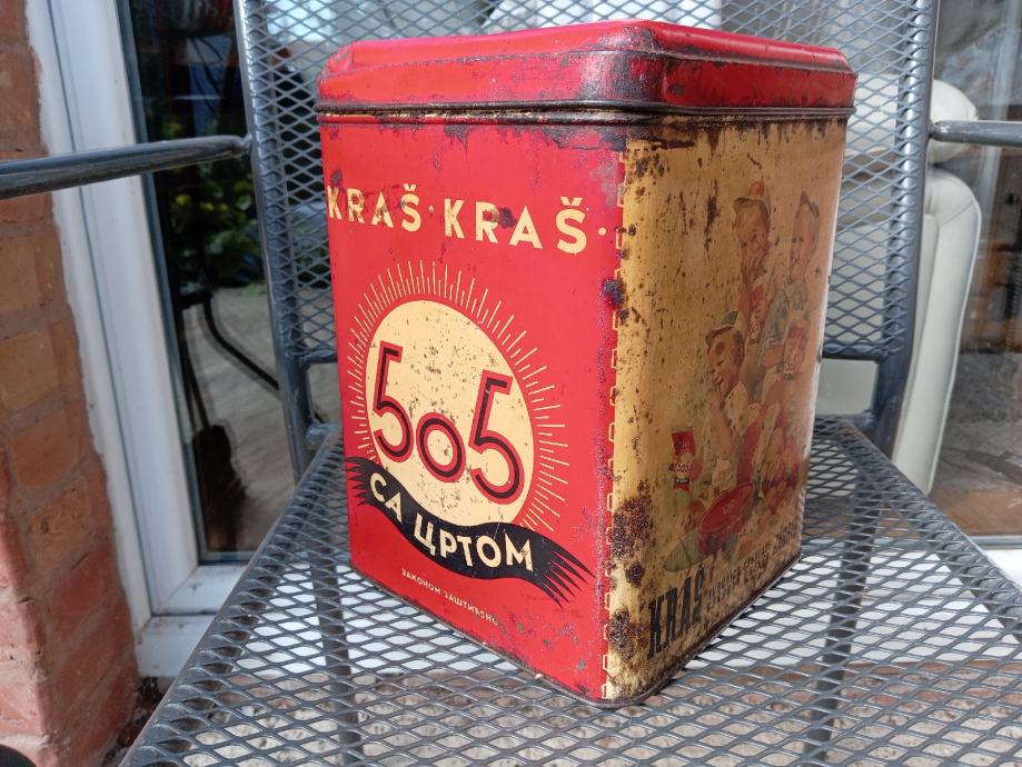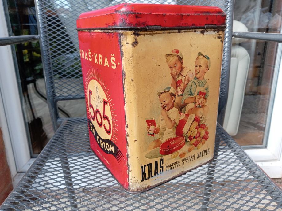 Prodaje se velika limena kutija od bombona Kraš 505 sa crtom, proizvedena davnih 50-tih godina prošlog stoljeća, na dvije strane ima motiv djece Dimenzije: visine 26 cm i širine 18 x 18 cm. Kutija ima oštećenja u vidu tragova korozije, ali ništa posebno, s obzirom na godište. Sve vidljivo na slikama.