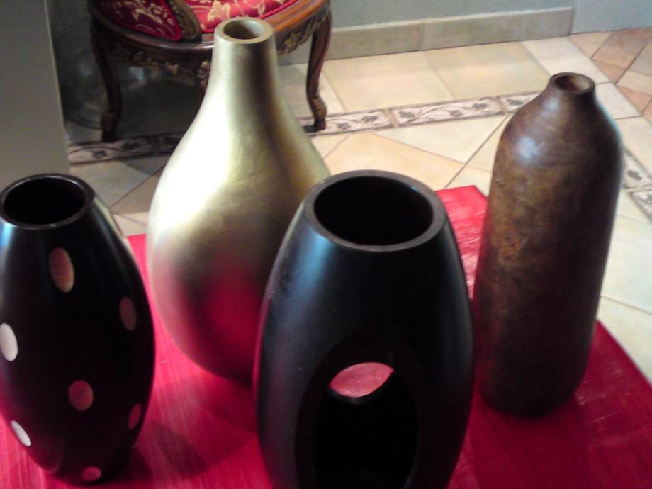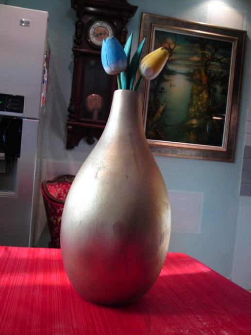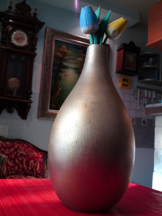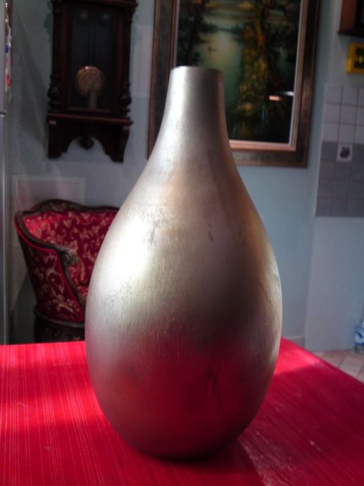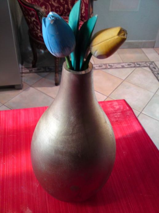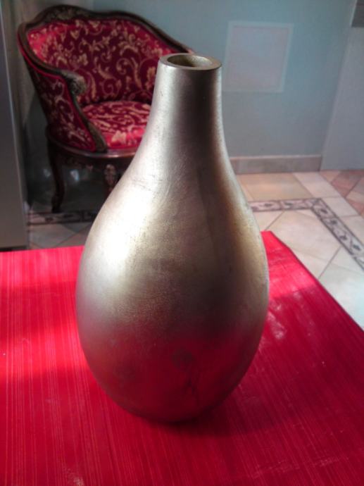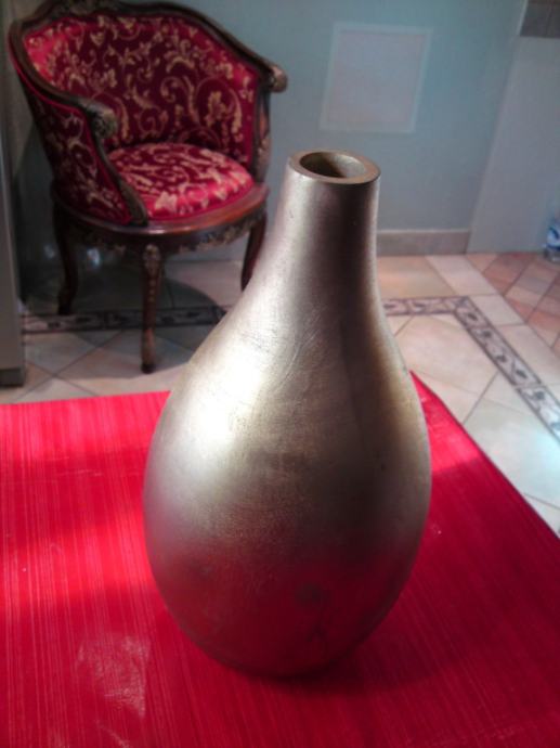 Vaza od egzotičnog drveta, u zlatnoj boji; dimenzije: visina: 38,0 cm; promjer: 20,5 cm; promjer otvora: 3,5 cm.