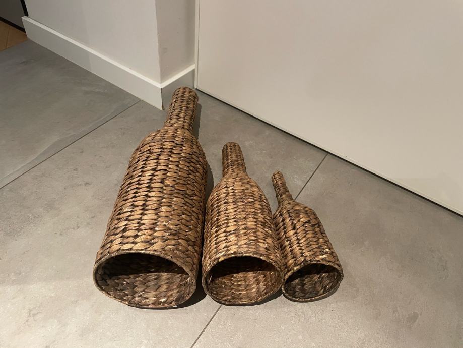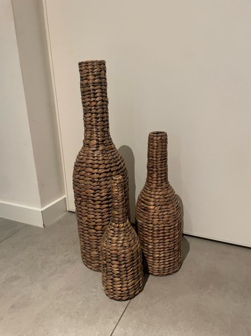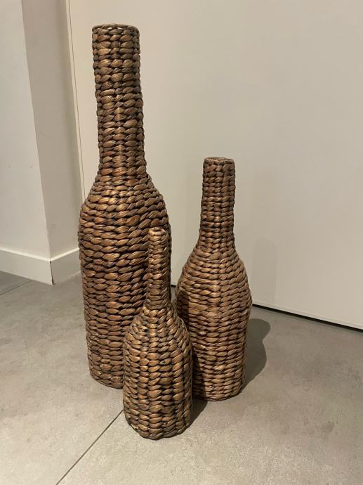 Prodaju se dekorativne vaze 3 komada ukupno visine velika 65cm, srednja 45cm i mala 35cm. Konstrukcija vaza je metalna i oblozena morskom travom. Vaze su funkcionalne i bez ostecenja. Mogucnost dostave na podrucju grada Zagreba prema dogovoru.