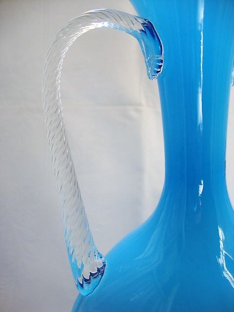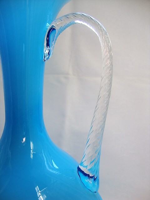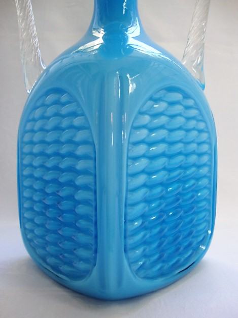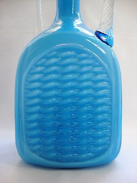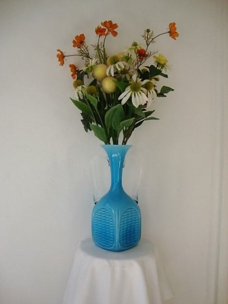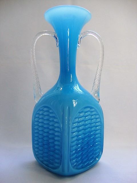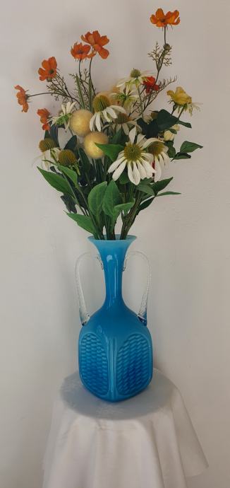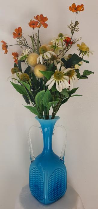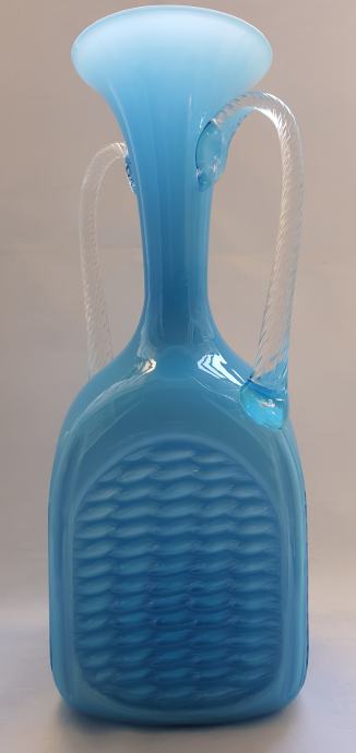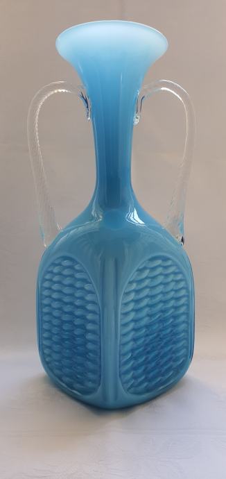 Opalinsko plavo staklo, ručke uvijene prozirnim muranskim staklom, tijelo dezen košare, prelijevanje plave boje stakla ovisno o količine na kojoj je vaza izložena