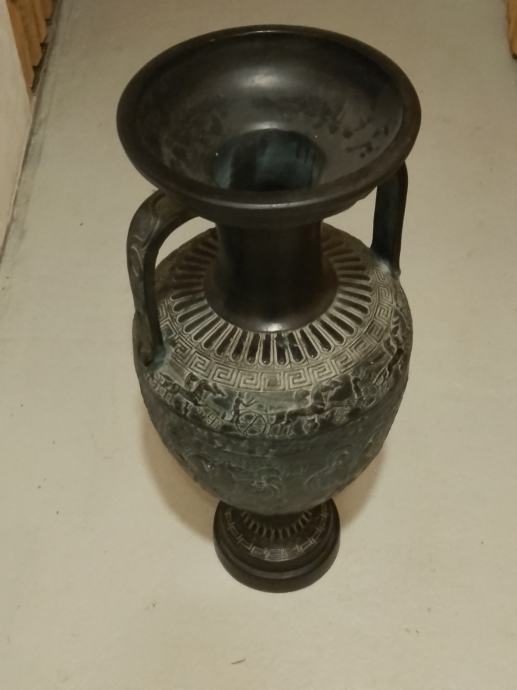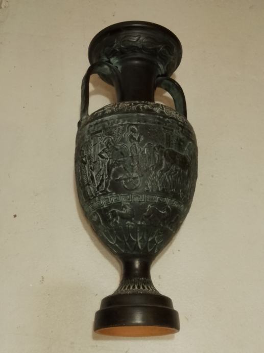 Vaza masivna, tamno smeđa, sa motivima iz grčke mitologije, dimenzije su cca. 35cm širina i cca. 85cm visina