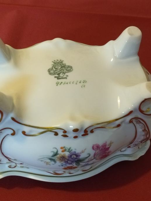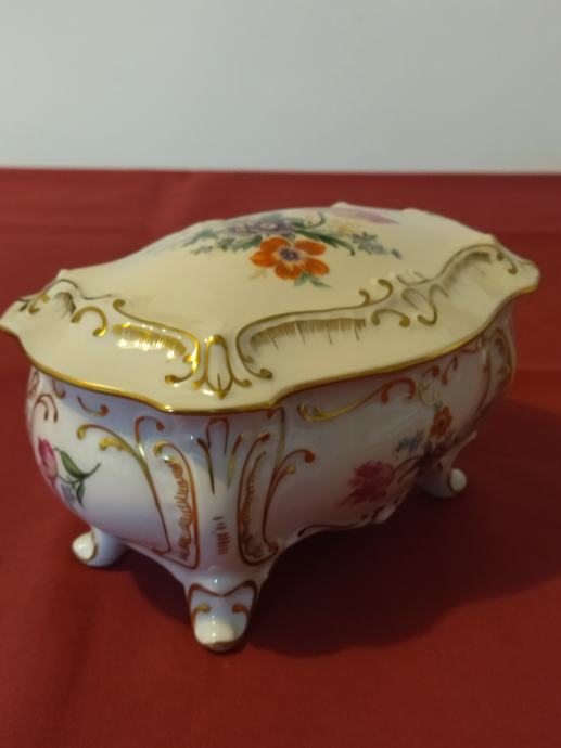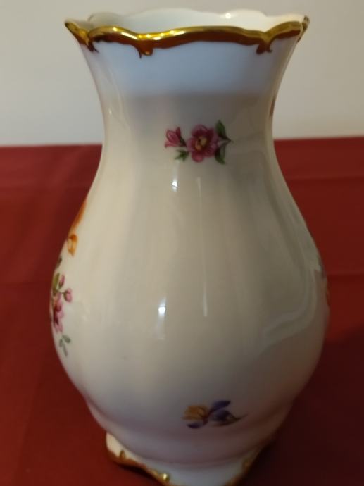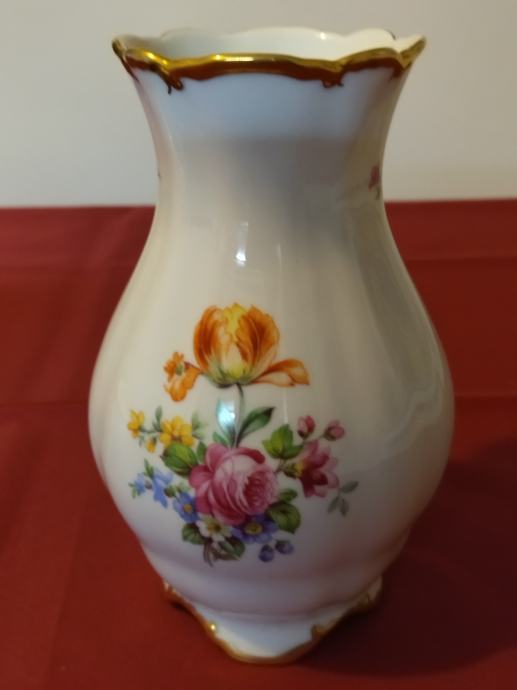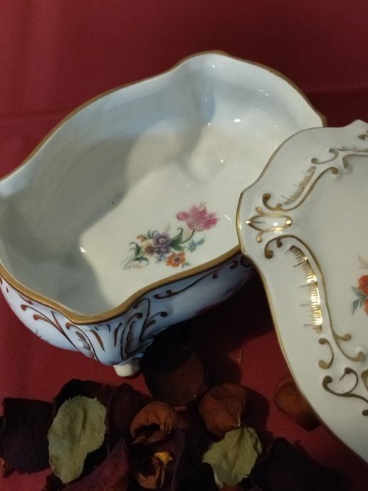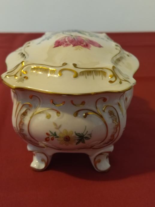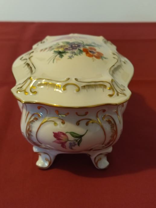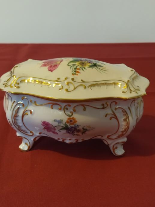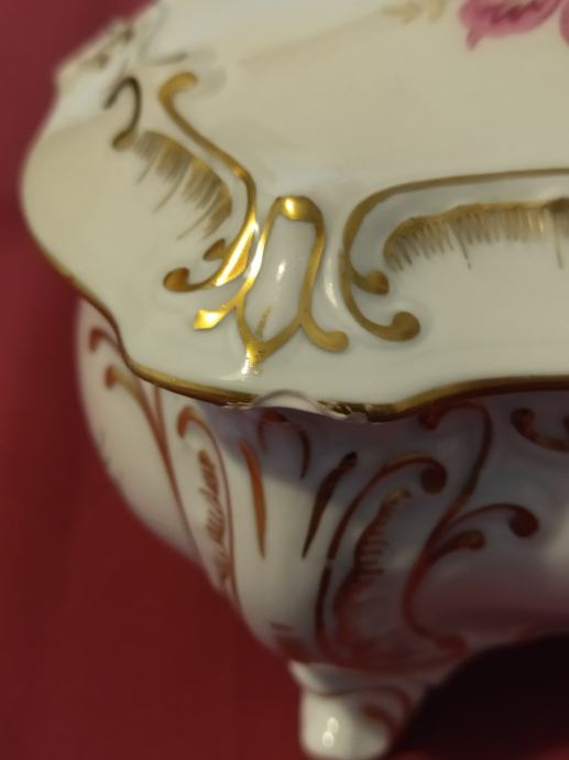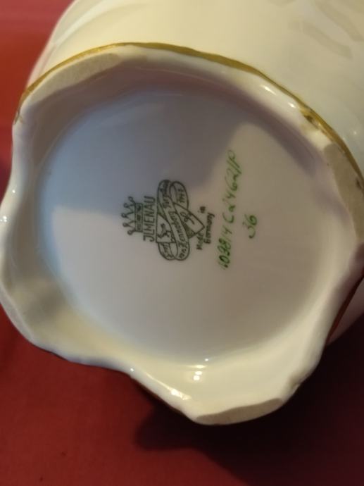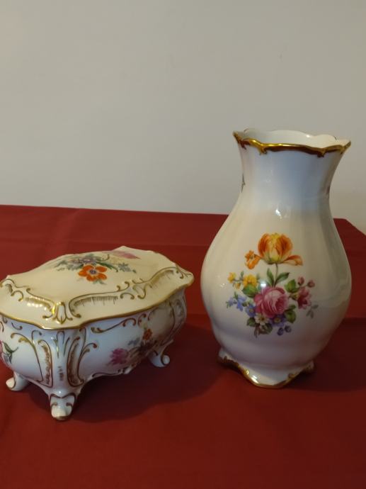 Vaza i kutija za nakit renomiranog njemačkog proizvođača porculana JLMENAU. Oba predmeta ručno oslikana cvijetnim motivima i bogato ukrašena 24K pozlatom. Svaki predmet ima žig i serijski broj.