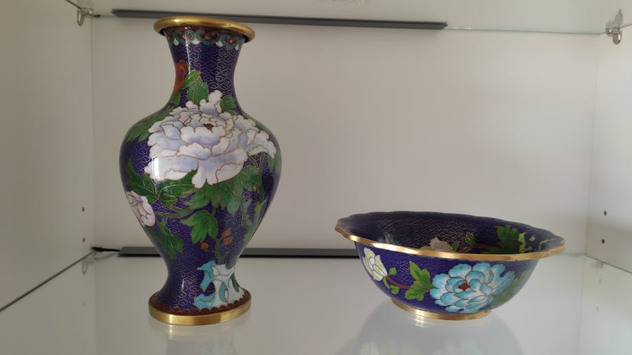 Tamno plava vaza i zdjelica sa japanskim motivom.