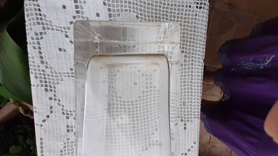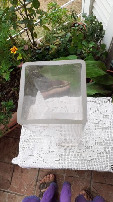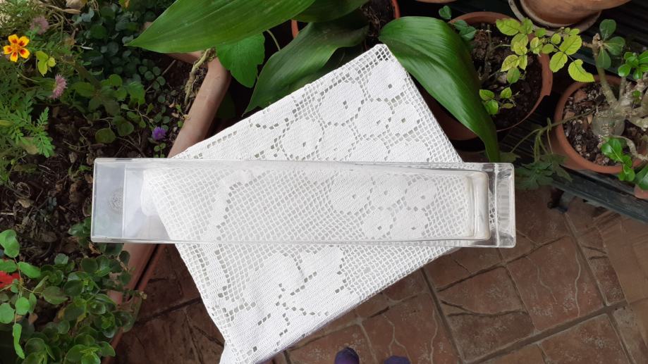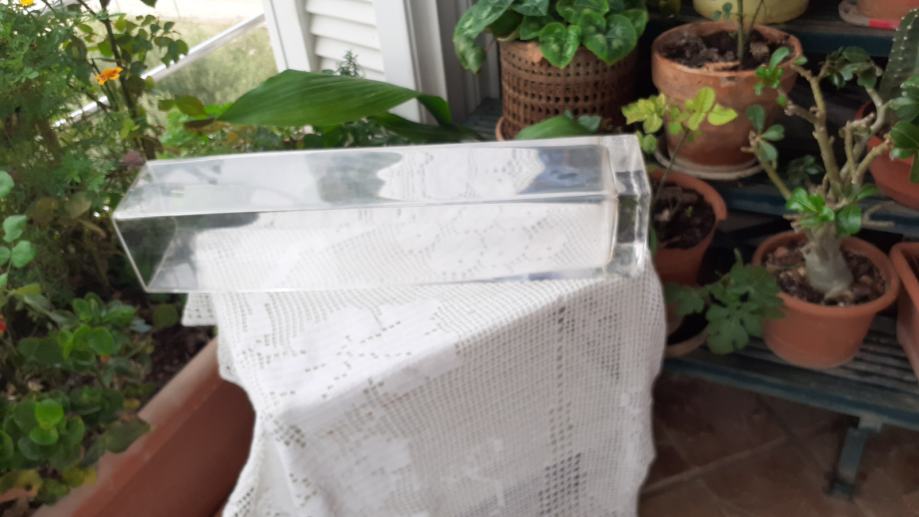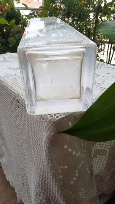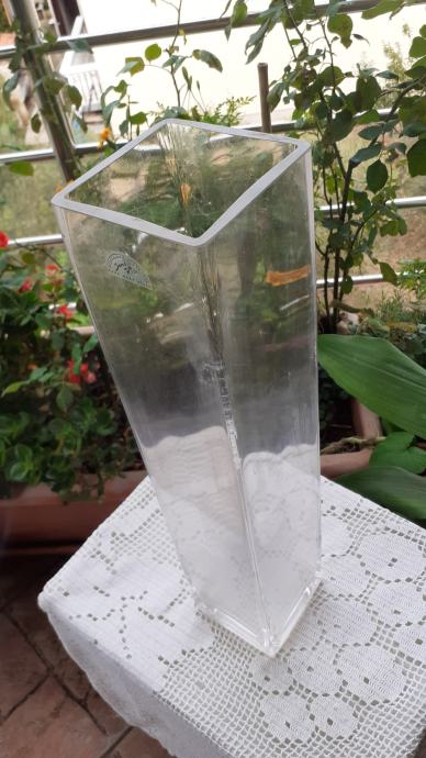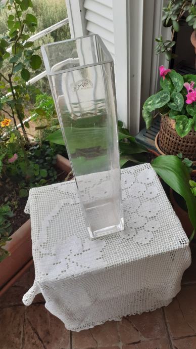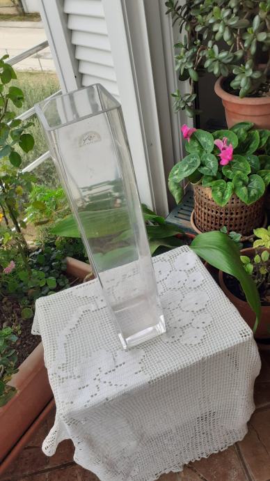 Predivna staklena vaza kvadratnog oblika, stabilna, masivna, ručni, dizajnerski rad, sa oznakom proizvođača. Visina je 50 cm, debljina dna 3 cm, debljina ostalog dijela 1cm, dno je 10x10 cm, kao i otvor na vrhu.