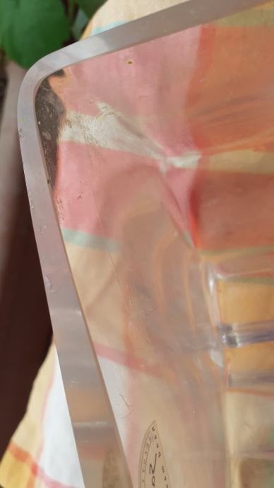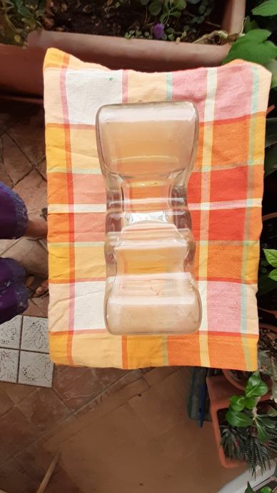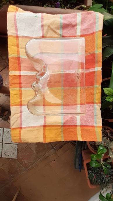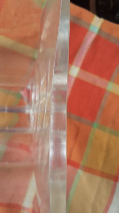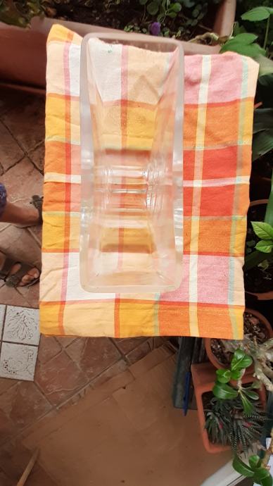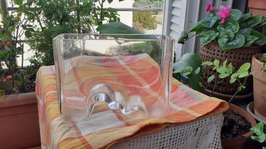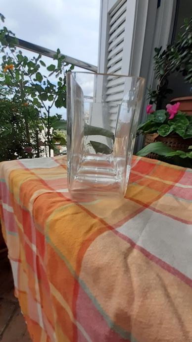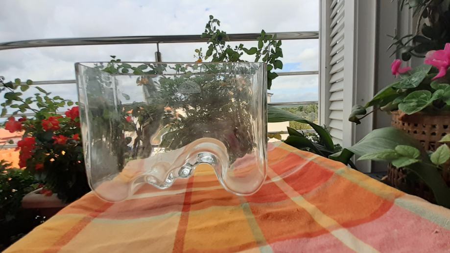 Predivna staklena vaza pravokutnog oblika, stabilna, masivna, ručni, dizajnerski rad, sa oznakom proizvođača. Visina je 15 cm, debljina od 1-3 cm radi valovitog dna, dno i otvor na vrhu je 20x8 cm. Bez greške.