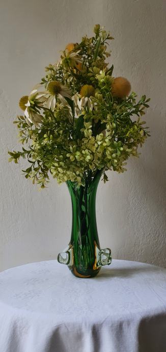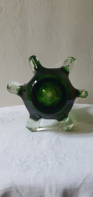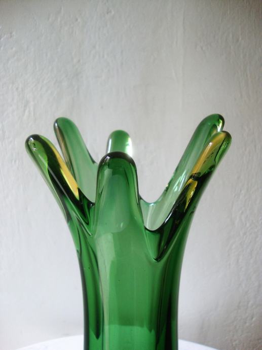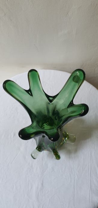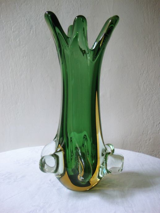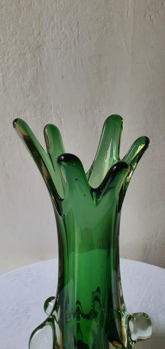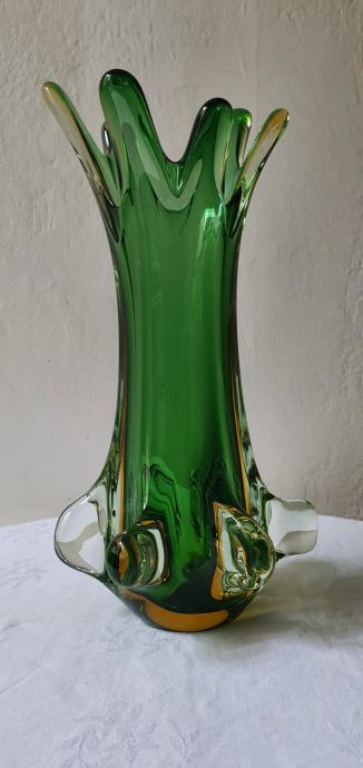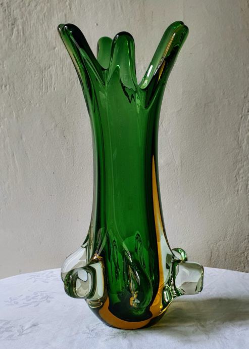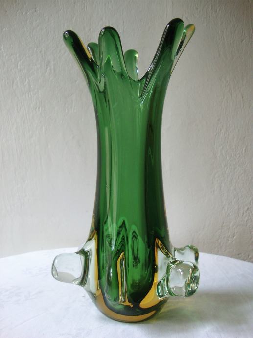 Predivna kolekcionarska vaza od dvobojnog stakla (smaragdno zelena i jantarno smeđa) ručno puhano staklo od strane talijskog majstora Flavio Poli Murano Italija 1960. godine