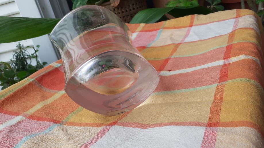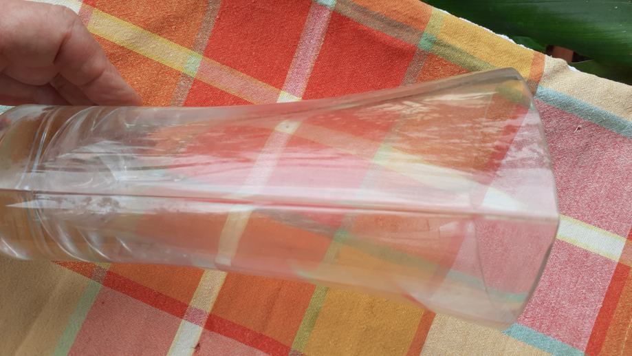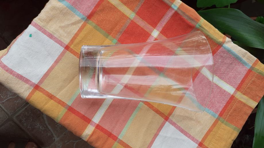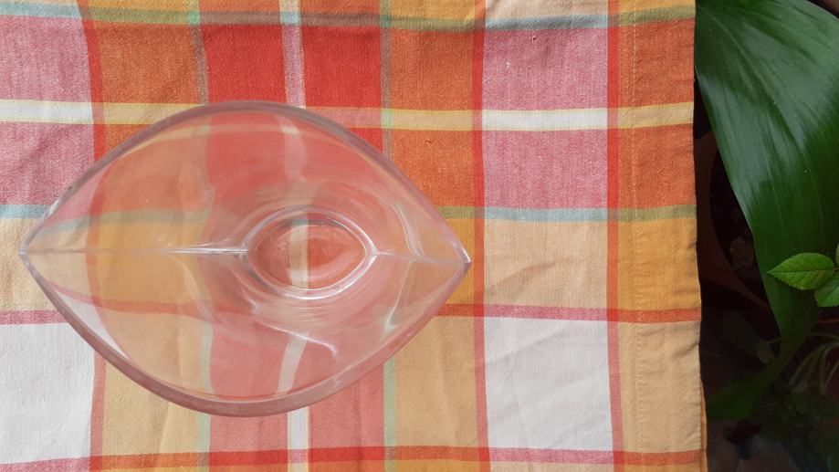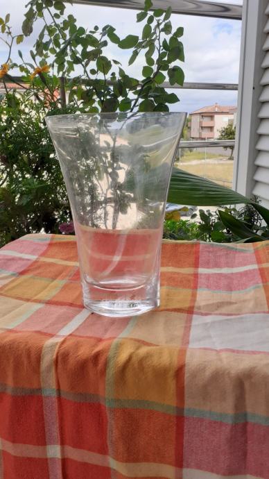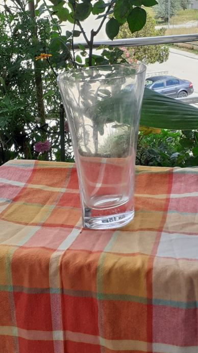 Predivna staklena vaza, stabilna, masivna, ručni, dizajnerski rad, sa oznakom proizvođača. Visina je 20 cm, debljina dna 3 cm, debljina ostalog dijela 0,3 mm, pri vrhu širina je 14x10 cm, dno 9x6 cm. Bez greške.