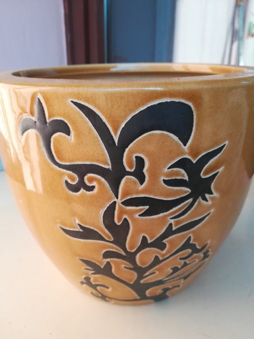 Ukrasna posuda za cvijeće od kvalitetne keramike, s kineskim simbolima na dvije suprotne strane. Visina 20 cm, a širina 22 cm, nekorištena.