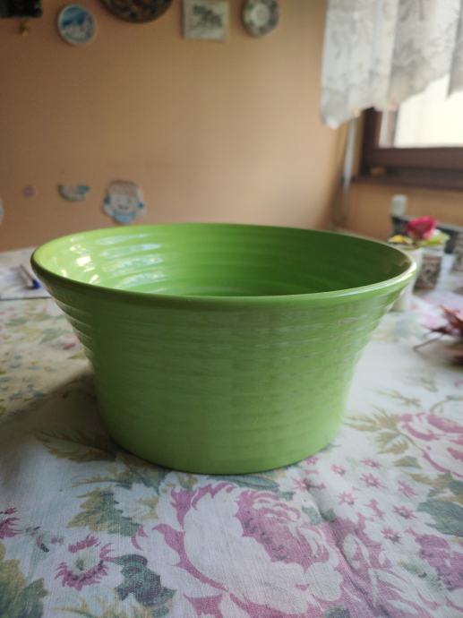 Posude za cvijeće: jedna manja, 13 × 18 cm, zelenkastožute boje, i jedna veća, 20 × 25 cm, lijepe zelene boje, od kvalitetne keramike, nekorištene. Cijena za obje 12 eura. Može i pojedinačno ( manja 5, a veća 8 eura.