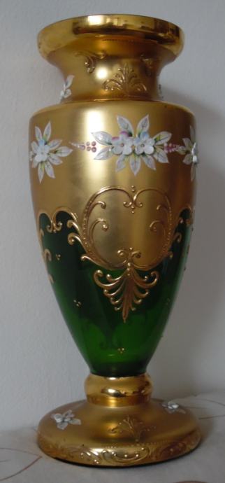 Staklena rijetka vaza s bogatom dekoracijom čeških majstora. Originalna naljepnica. Poznata manufaktura Bohemia. Savršeno stanje. Osnova, zeleno staklo. Rijetka prilika za malu cijenu. Ulaganje u umjetnine.