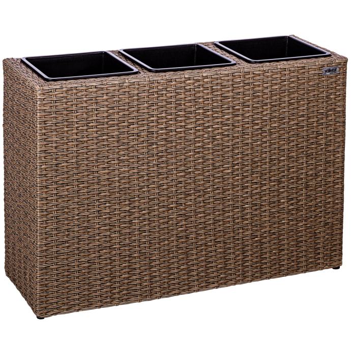 Ovaj set posuda za cvijeće sastoji se od okvira od poliratana i tri uklonjive plastične posude s odvodima za vodu koji se mogu ponovno zatvoriti, a koje se koriste za sprječavanje nakupljanja vode