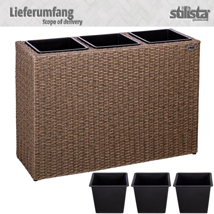 Naše prekrasne posude za cvijeće STILISTA sastoje se od okvira od ratana i tri uklonjive posude. Izrađena od izdržljivog i vodoodbojnog poliratana, ova je žardinjera prednost za unutarnju i vanjsku upotrebu. Posude za biljke imaju plastične posude s odvodom za vodu koji se može ponovno zatvoriti, što sprječava da vaše biljke i cvijeće budu natopljeni vodom. Posuda za cvijeće dostupna je u crnoj, krem, smeđoj i sivoj boji.