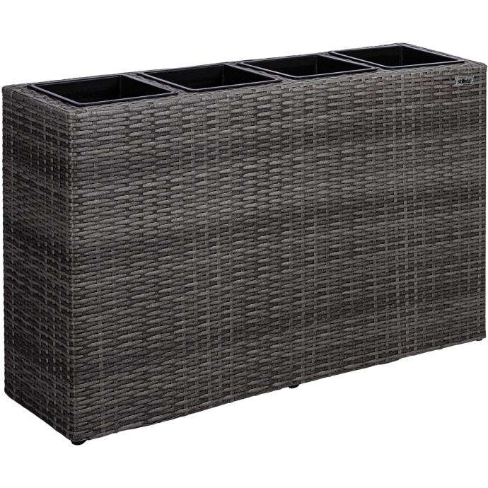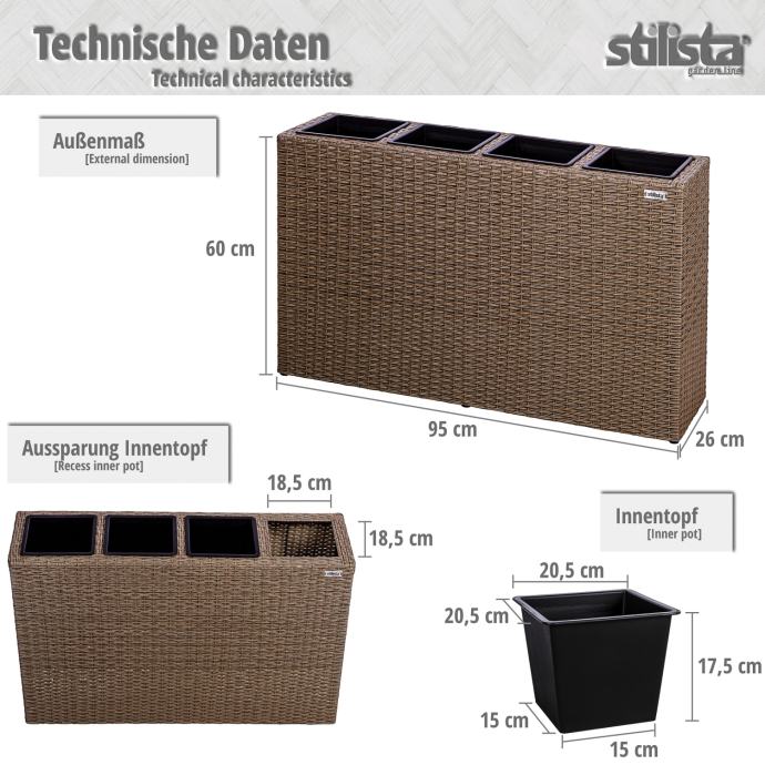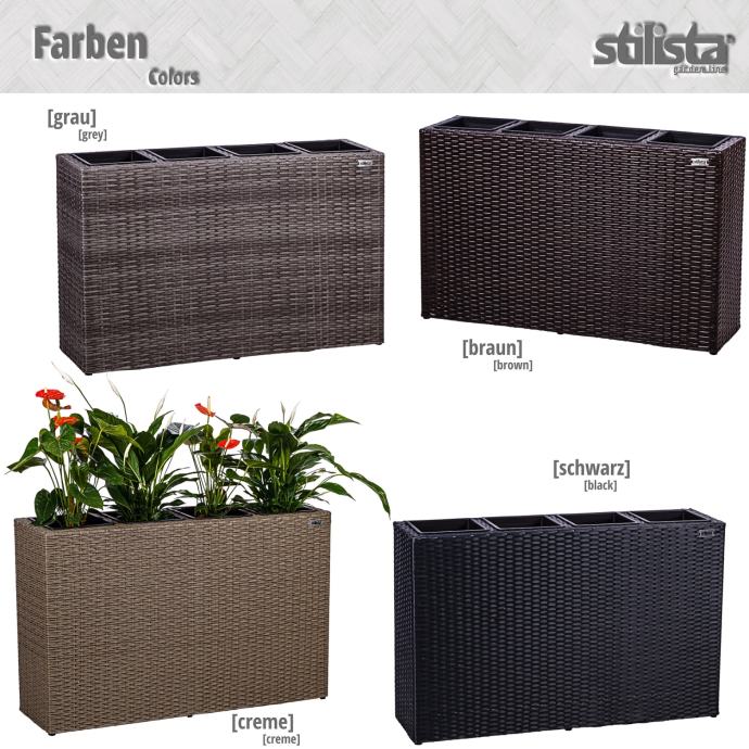 Naše prekrasne posude za cvijeće STILISTA sastoje se od okvira od ratana i četiri uklonjive posude. Izrađena od izdržljivog i vodoodbojnog poliratana, ova je žardinjera prednost za unutarnju i vanjsku upotrebu. Posude za biljke imaju plastične posude s odvodom za vodu koji se može ponovno zatvoriti, što sprječava da vaše biljke i cvijeće budu natopljeni vodom. Posuda za cvijeće dostupna je u crnoj, krem, smeđoj i sivoj boji.