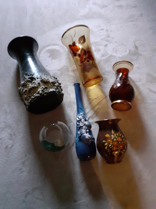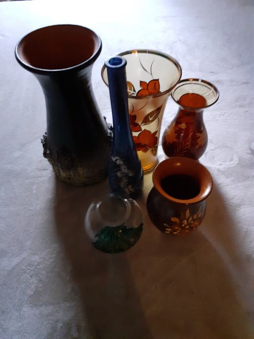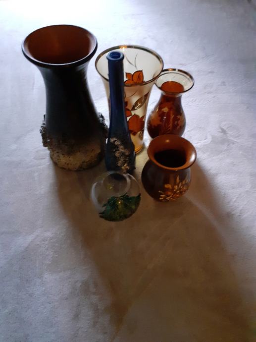 Tri vaze raznih veličina i oblika. Dostupne su 3 s lijeve strane, druge 3 su prodane. Cijena za sve tri je 11 €, može i pojedinačna kupnja, u tom slučaju je cijena najveće vaze 7 €, ostale po 3 €. Prva vaza slijeva u gornjem redu je masivna, velika i teška, kvalitetna. Visina je 32 cm, promjer na vrhu i dnu 15 cm. U donjem redu prva slijeva je visoka 11cm, promjer otvora gore i dolje 7 cm. Druga je visoka 35 cm, otvor gore radijusa 3 cm, dolje 6.5 cm.
