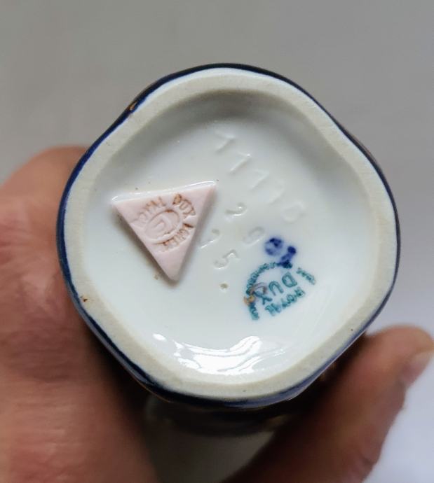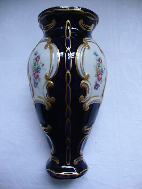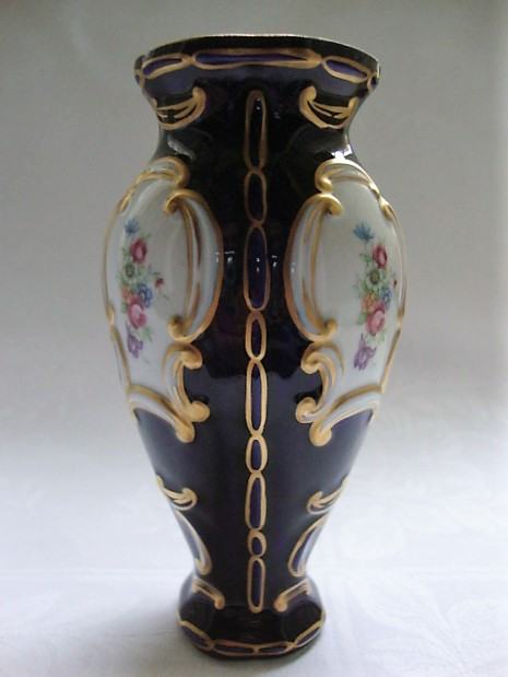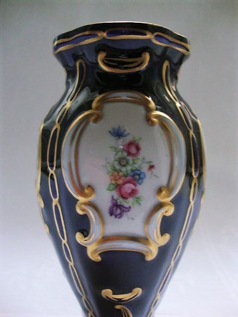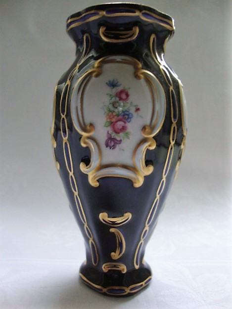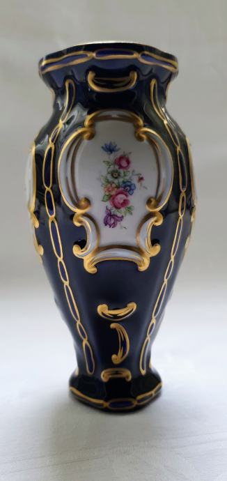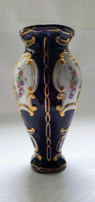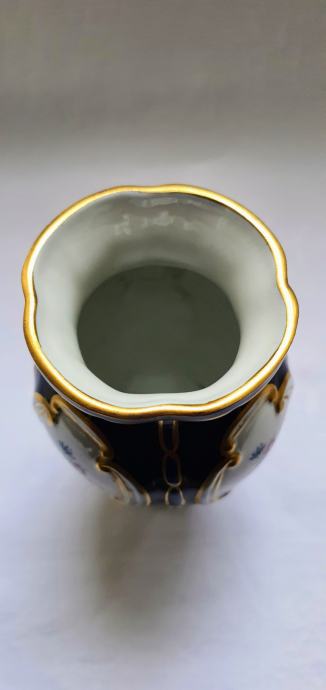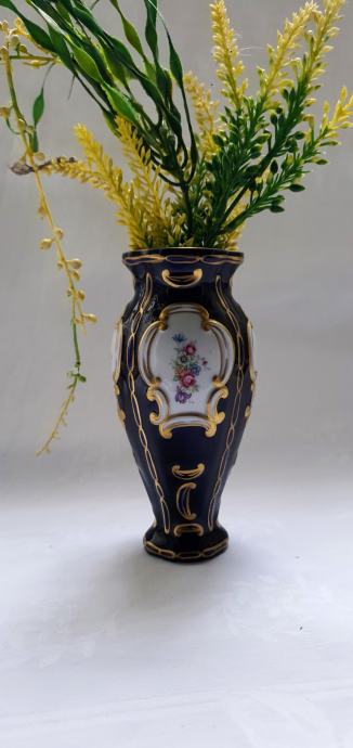 Vintage stara kobaltna ručno oslikana vaza sa pozlatom iz kolekcije Grofica Royal plava hrva šarenog cvijeća u bijelom medaljonu sa se četiri strane