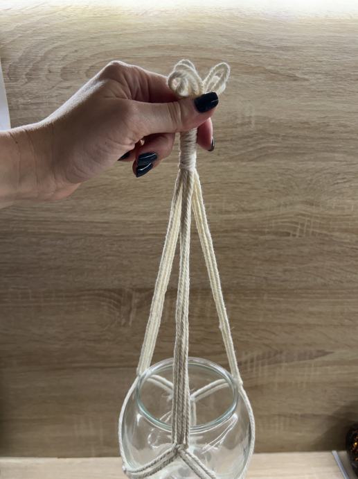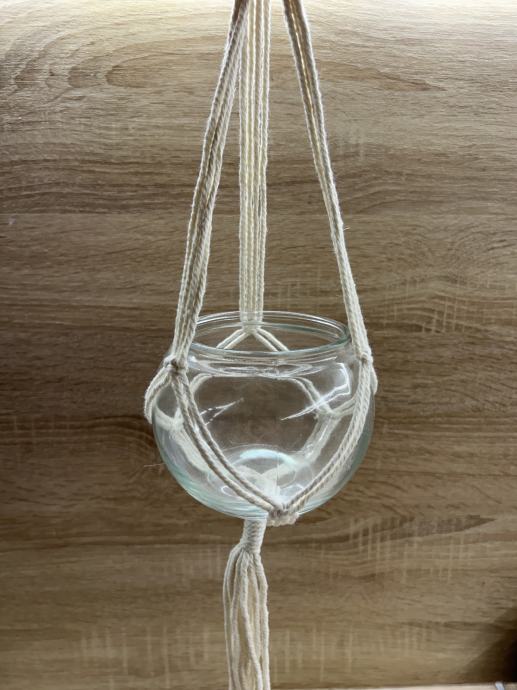 Dekorativna mini vaza s jednostavnim makrame držačem od pamučne špage, idealna za boho dekor. Može se objesiti na zid, strop ili balkon.