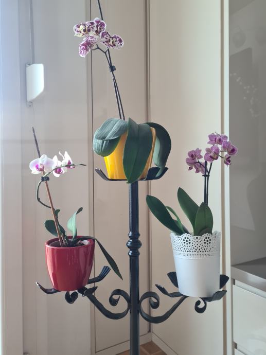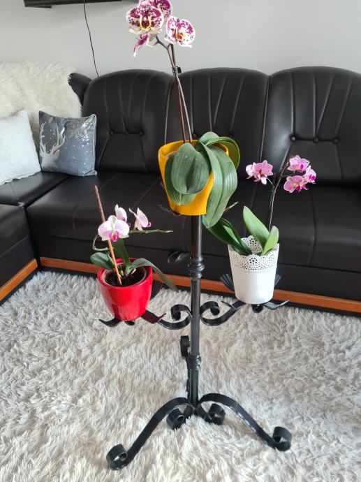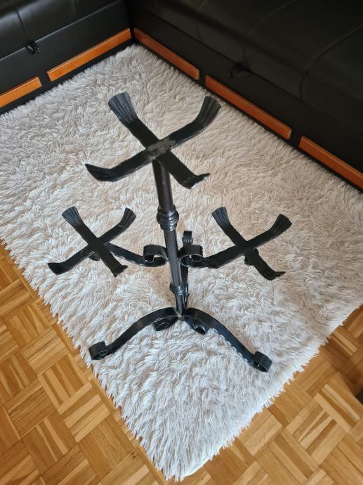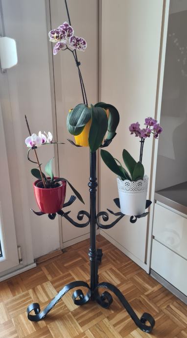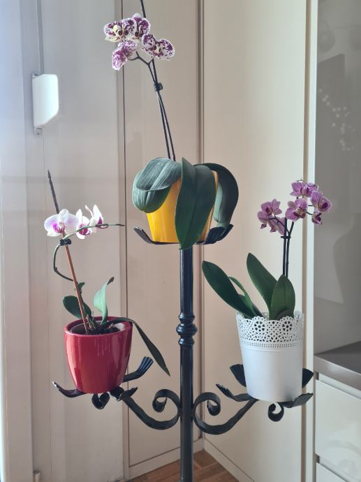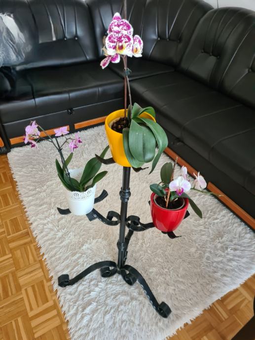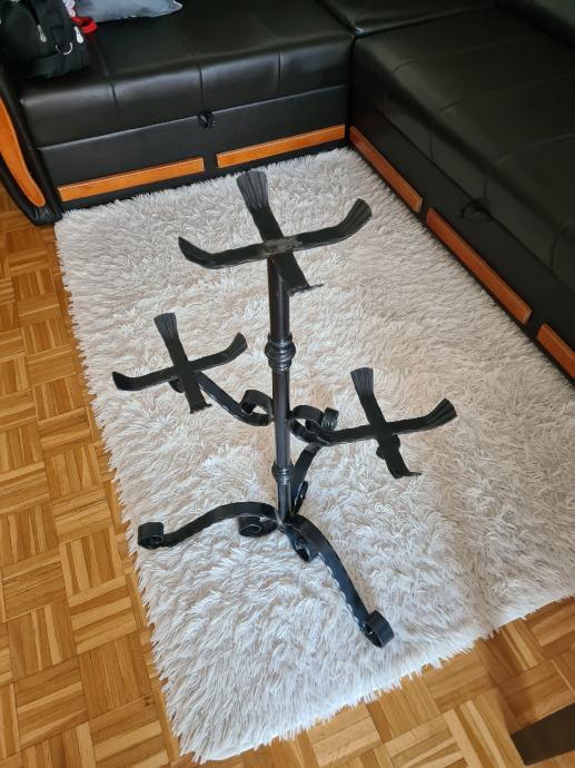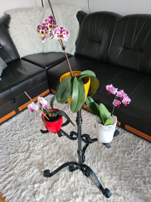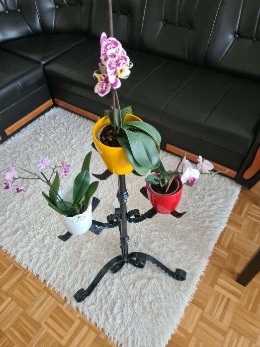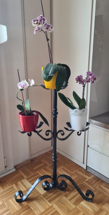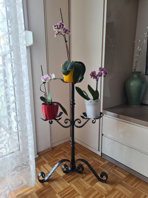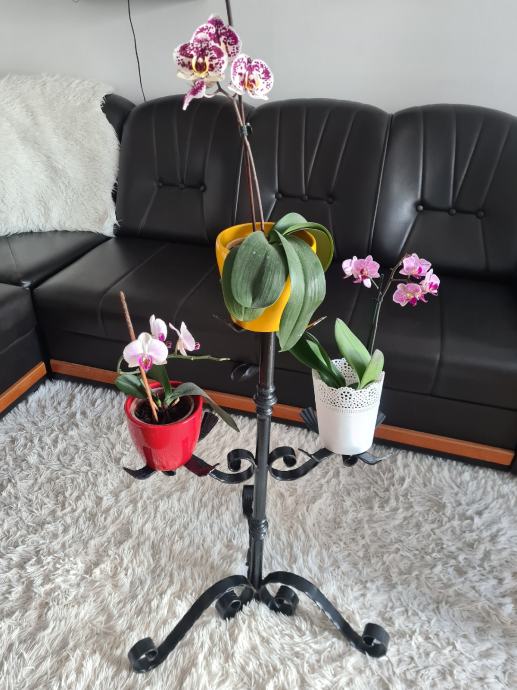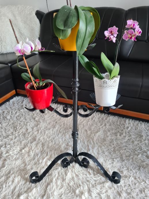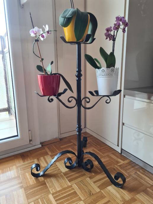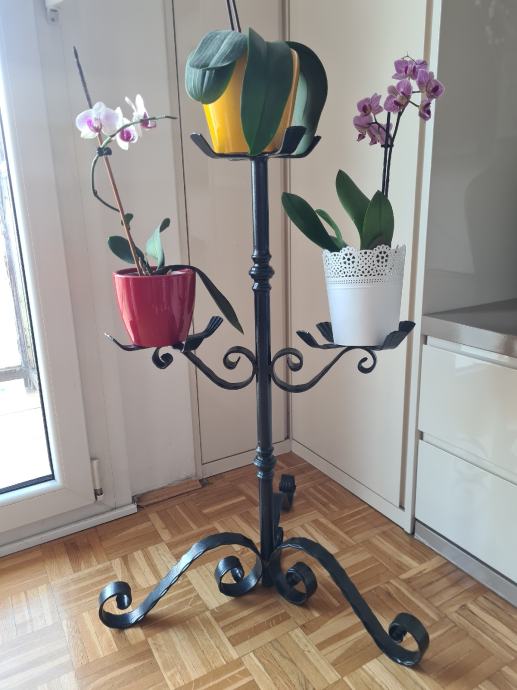 Stalak za cvijece od kovanog željeza, za 3 teglice, crne boje, prekrasno. Ručni rad