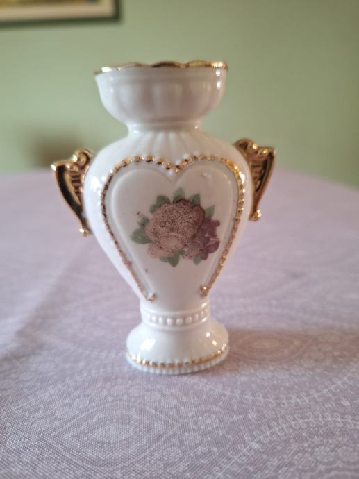 Prodajem starinsku porculansku vazu bijele boje s pozlaćenim detaljima. Rabljena bez značajnih oštećenja, visine otprilike 9 cm.