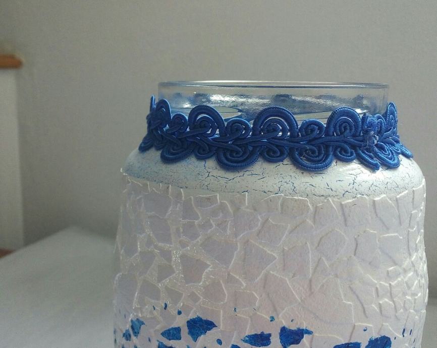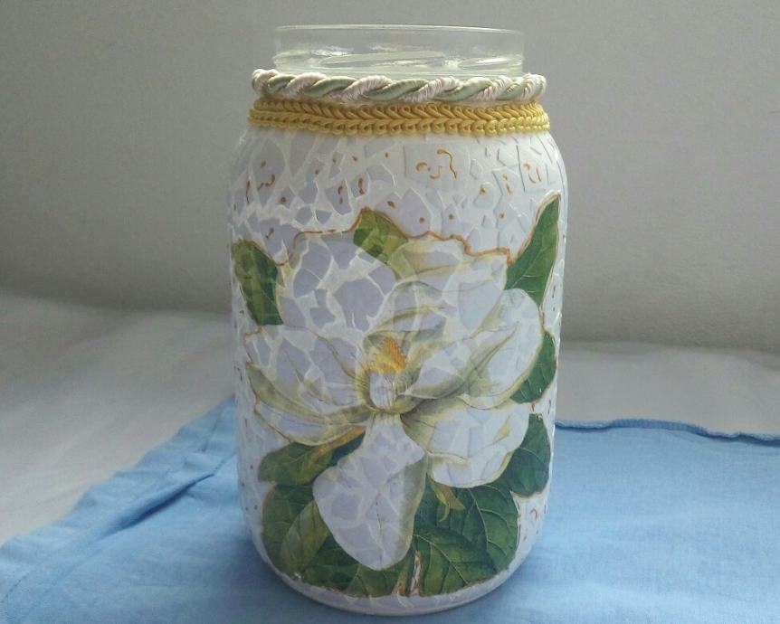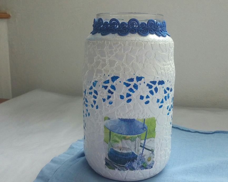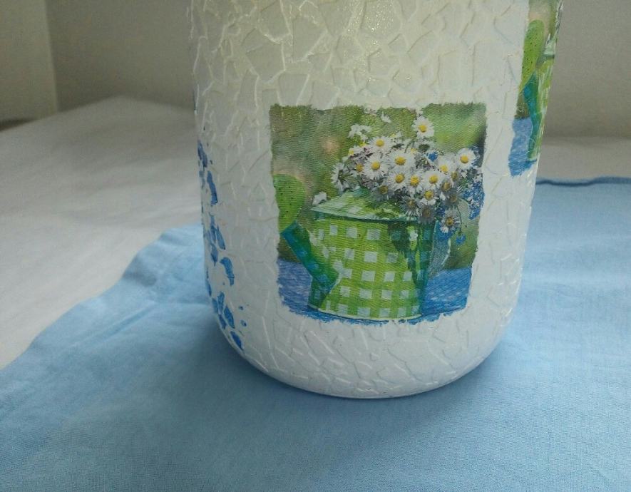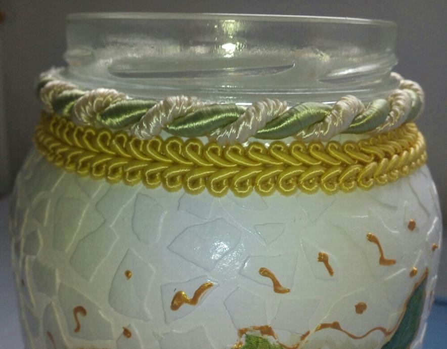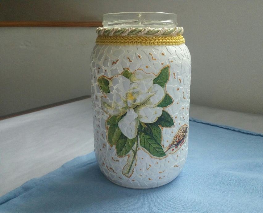 Staklenka ukrašena ljuskama jaja ,ja i podloga,zatim akrilna boja,dekupaž i završni sloj lak.Imam dvije veće cijena za komad je 15 eura.