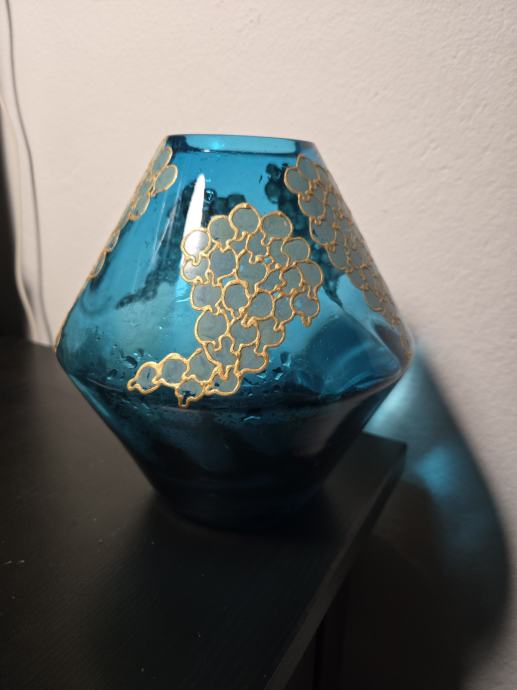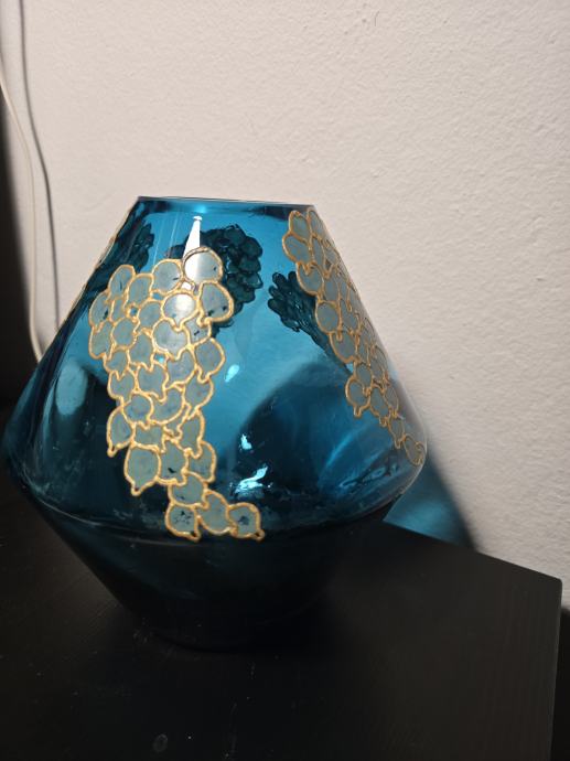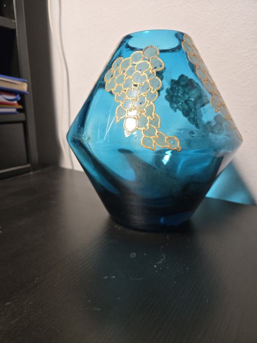 Oslikana ručno. Promjet na vrhu s debljinom stakla 7 cm. Staklo je debelo 8mm. Visina vaze oko 20 cm. Na vrhu... ori otviru kao točkice dva oštećenja... neznatna ali ipak