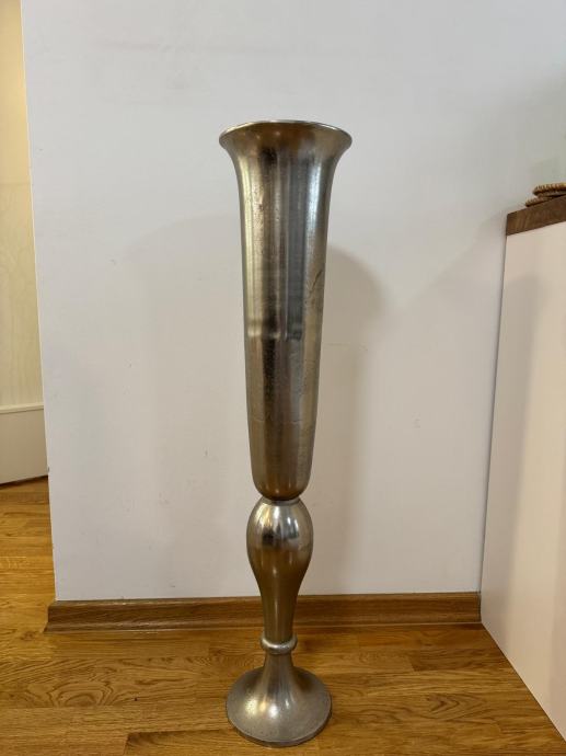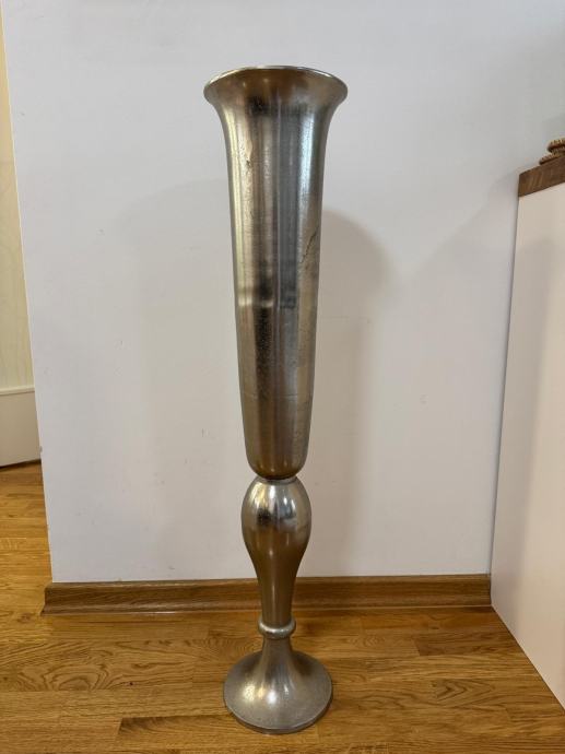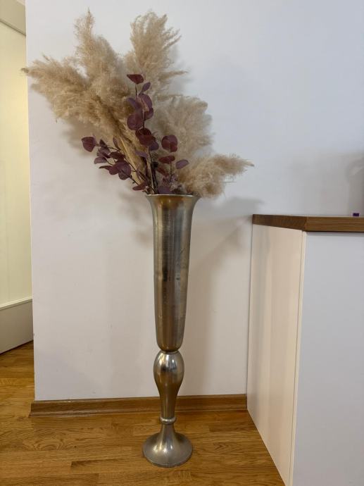 Prodajem visoku podnu vazu visine 90 cm u srebrnoj metalnoj boji. Vaza ima klasičan elegantni oblik s proširenim gornjim dijelom, vitkim središnjim dijelom i stabilnom okruglom bazom. Zbog svoje visine lijepo upotpunjuje svaki kutak prostorije, a posebno dobro izgleda s visokim suhim cvijećem ili ukrasnim travama.