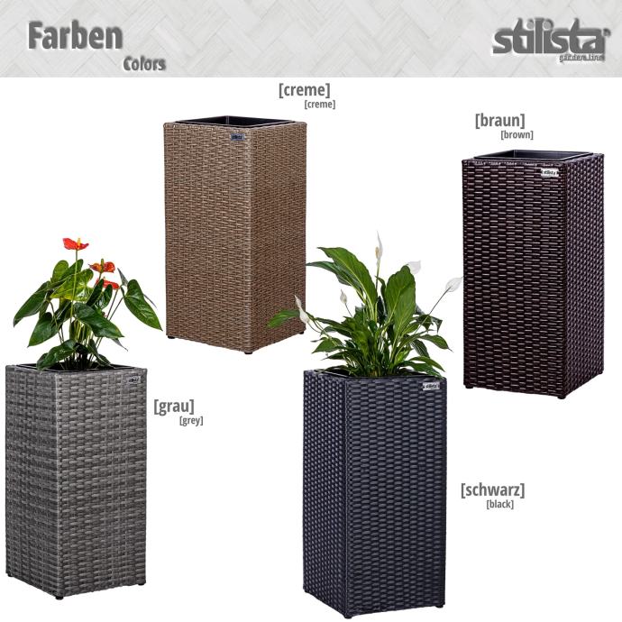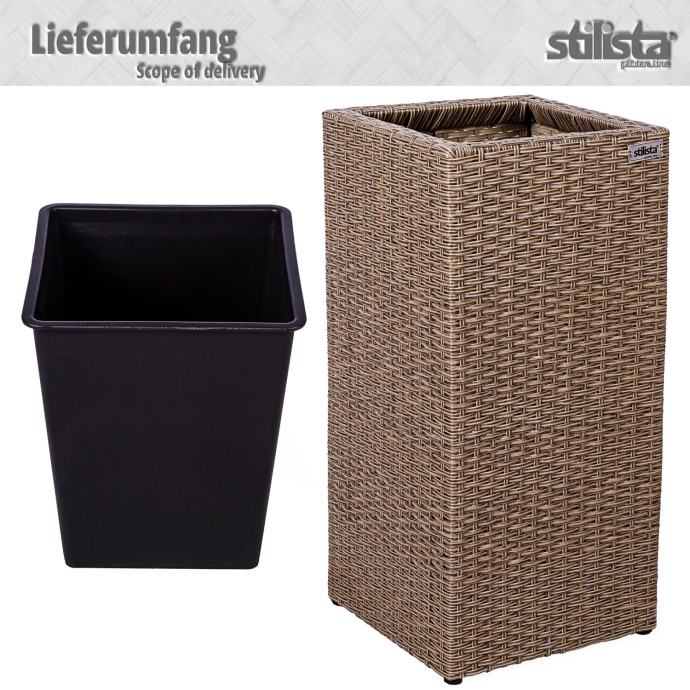 Naše prekrasne STILISTA stupne posude za cvijeće sastoje se od okvira od ratana i posude koja se može ukloniti. Izrađena od izdržljivog i vodoodbojnog poliratana, ova je žardinjera prednost za unutarnju i vanjsku upotrebu. Posude za biljke imaju plastične posude s odvodom za vodu koji se može ponovno zatvoriti, što sprječava da vaše biljke i cvijeće budu natopljeni vodom. Posuda za cvijeće dostupna je u crnoj, krem, smeđoj i sivoj boji.
