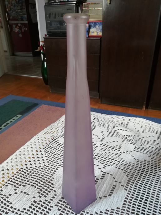 Lijepa vazica od obojenog stakla lila boje, visina 32, širina na dnu 5, a na vrhu 3 cm.