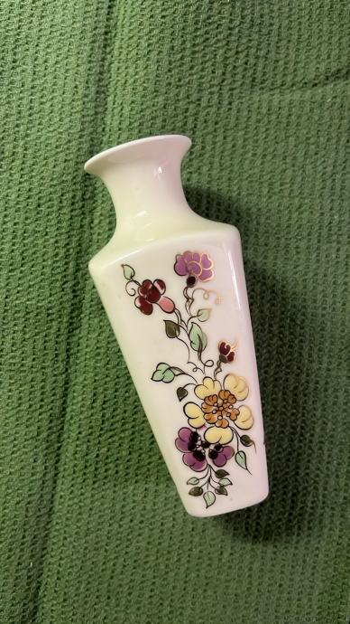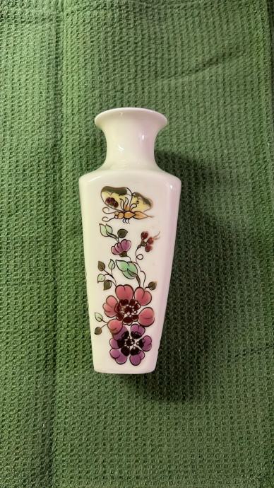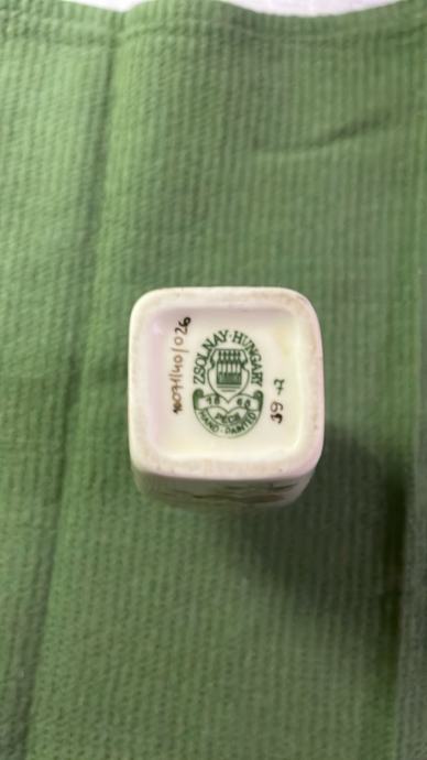 Mala vaza 11 cm, poznatog mađarskog proizvođača ukrasne keramika, SZOLNAY-HUNGARY , ručno bojano , sa zlatnim detaljima ( neznam dali je i ova sa 24 karatnim zlatom ili samo zlatnom bojom) svaki predmet ima svoj broj .