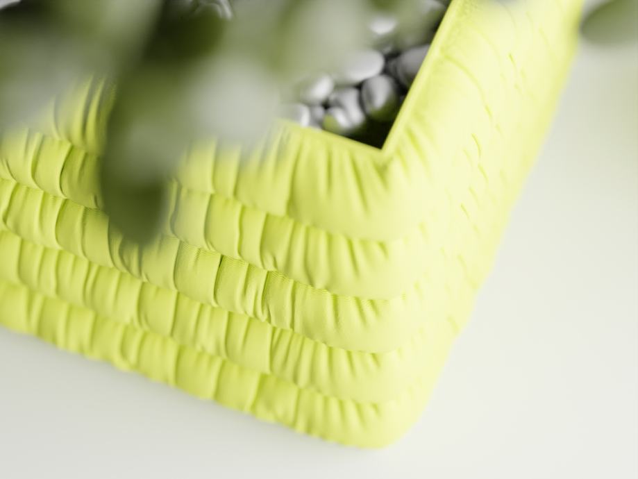 Nevjerovatna tekstura daje dubinski osjećaj mekanog jastuka, a zapravo je izrađena od biorazgradive plastike odnosno obnovljive biomase, obično od fermentiranog biljnog škroba poput kukuruza, kasave, šećerne trske ili pulpe šećerne repe.