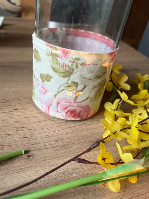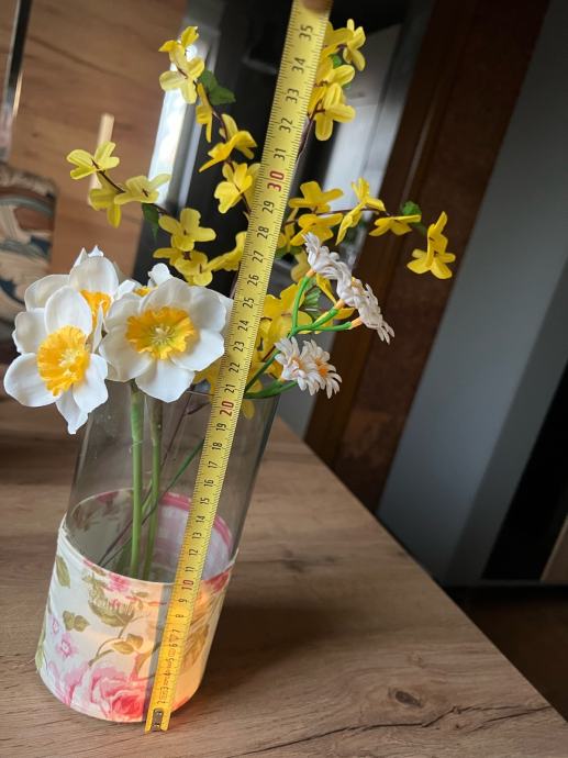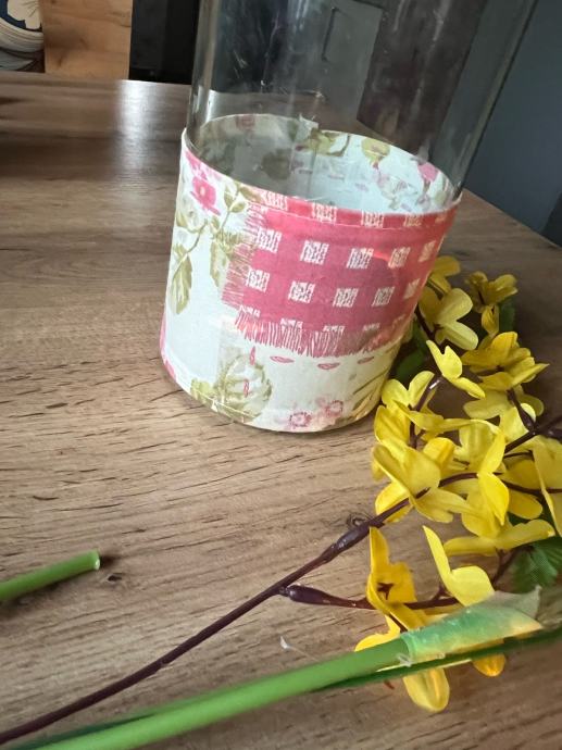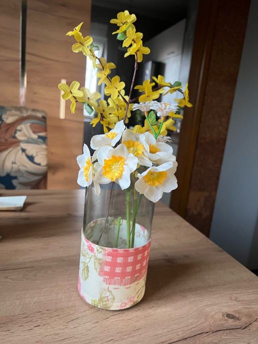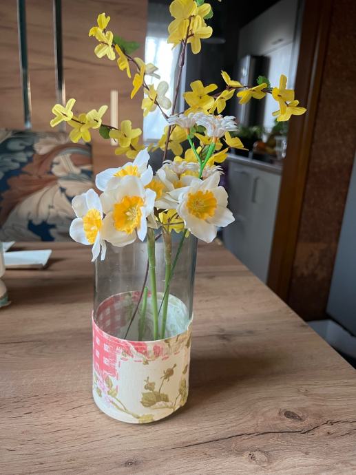 Prodajem staklenu vazu s ukrasnim tekstilnim omotačem sa cvjetnim uzorkom u roza i krem boji. Uz vazu dolazi i umjetno cvijeće – bijeli narcisi i žute grančice, forzicije ,koje lijepo upotpunjuju cijelu kompoziciju. Vaza je cilindričnog oblika, prozirnog stakla, srednje visine.