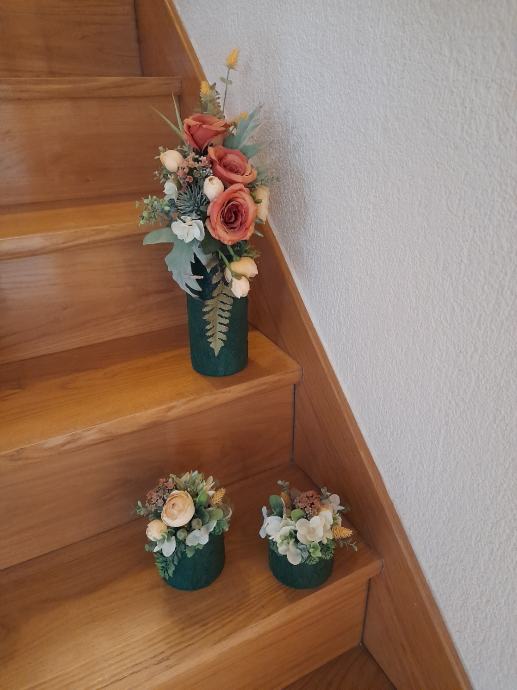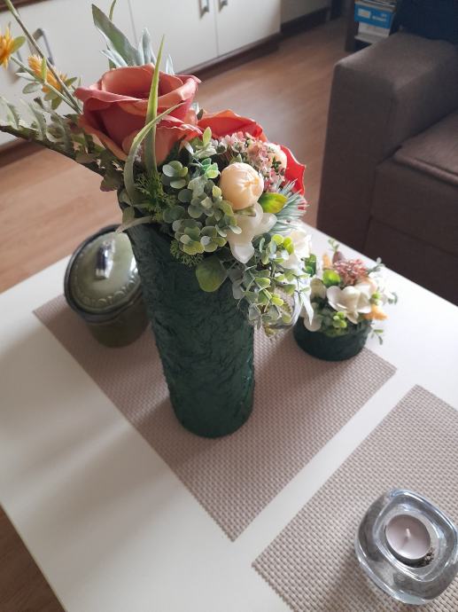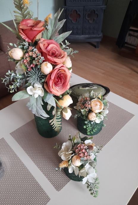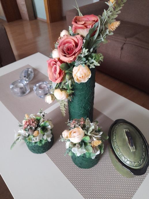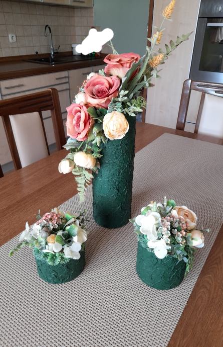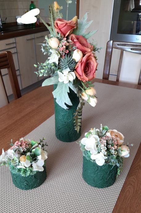Prodajem 3 vaze, velika i 2 male, radila sam ih salvetnom tehnikom, bojala bojom za beton, cvijece radeno u cvjecarni, nisu za zivo cvijece tj vodu samo suhe dekoracije, cijena 20 € plus trosak slanja , inf na tel 035 260 202