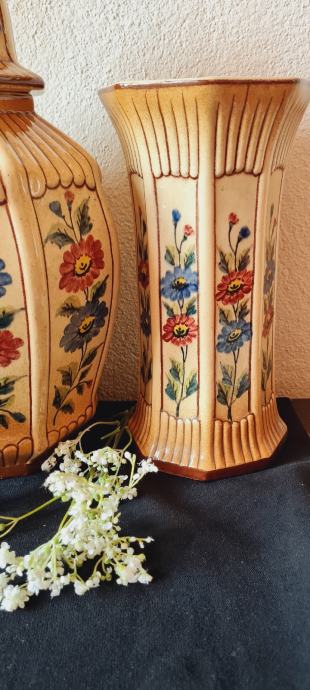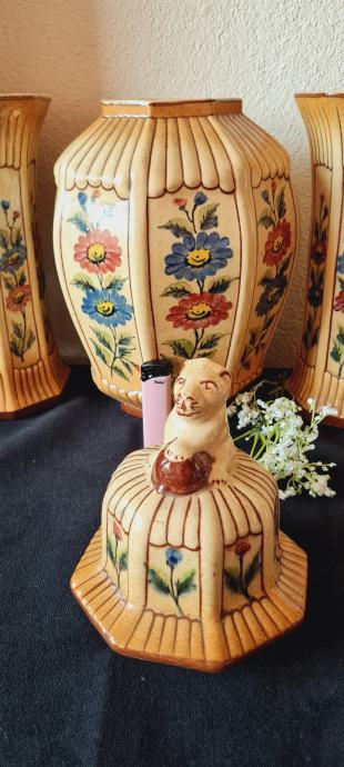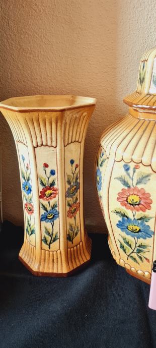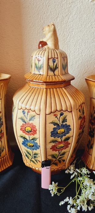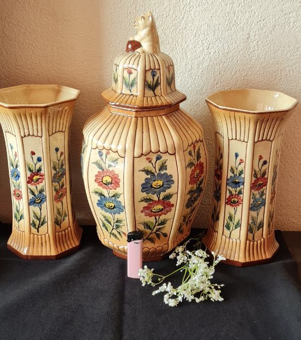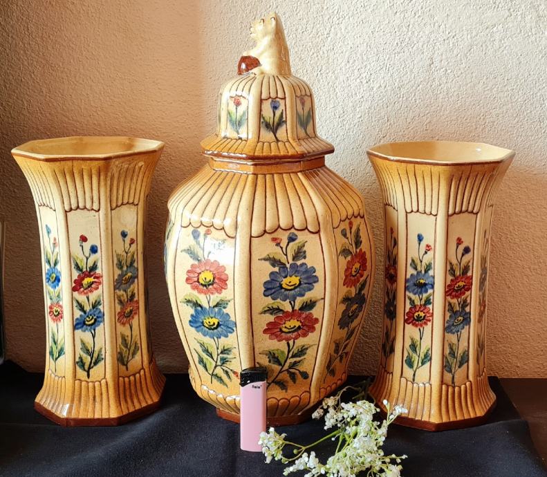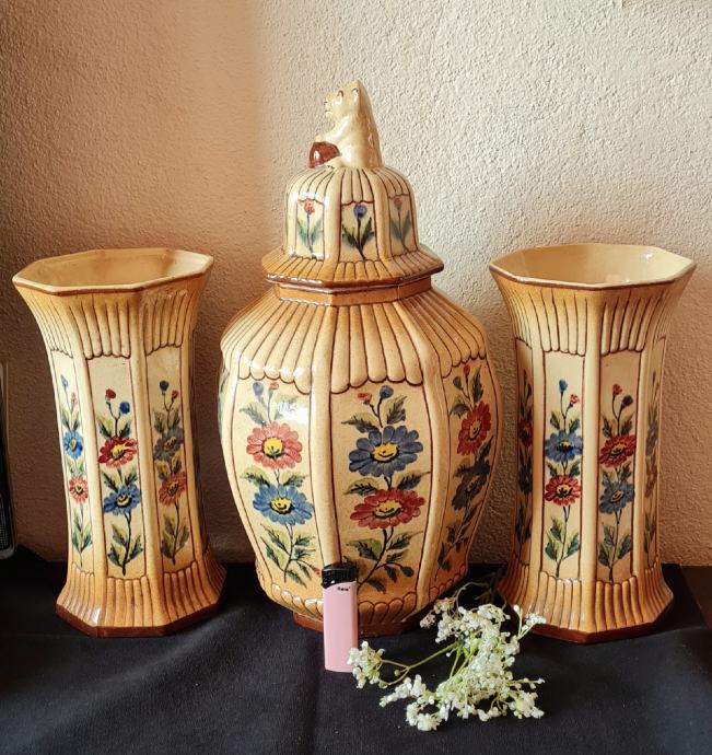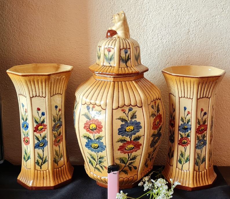 Set od tri stare velike keramičke vaze. 2 + 1 gratis. Baš su velike, i traže dosta prostora. Glazirane su i ručno oslikane. Da ih samo možete vidjeti uživo, oduševili biste se.