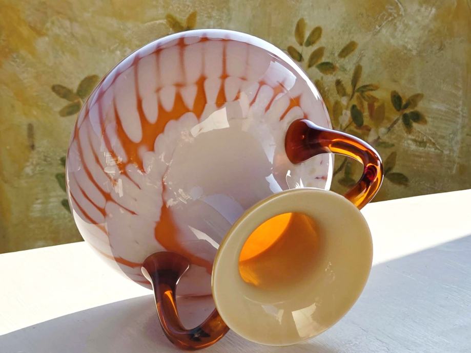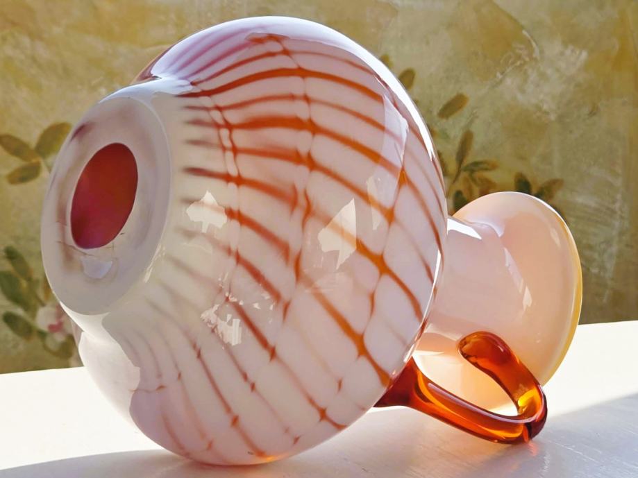 Dizajn: Kombinacija bijelog mliječnog stakla s narančastim/jantarnim nitima i prozirnim ručkama.