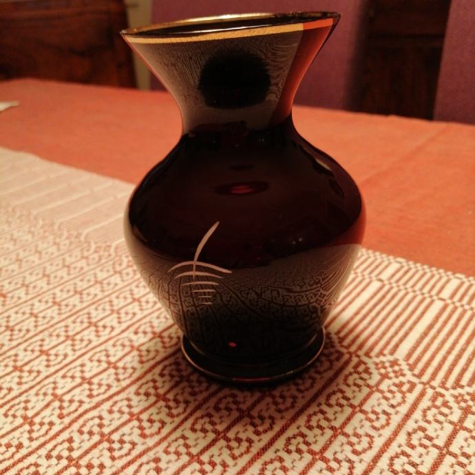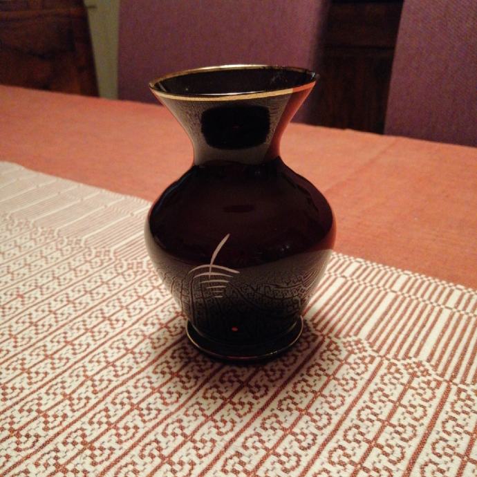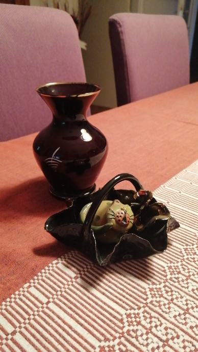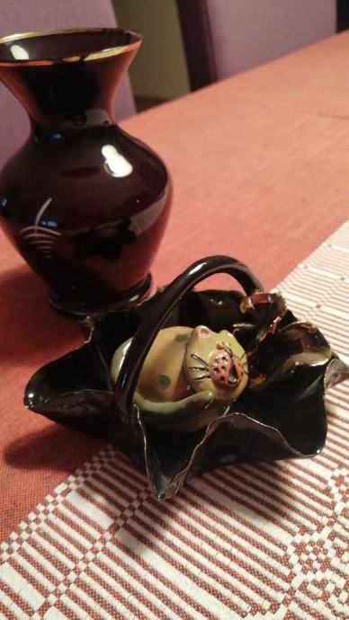 Prodajem vintage, staklenu vazicu iz 30-tih godina, ručno oslikanu, decentnim motivom na tamno ljubičastom, tankom staklu, te zlatnim linijama na rubovima. Vazica + zdjelica sa mačkicom 18€.