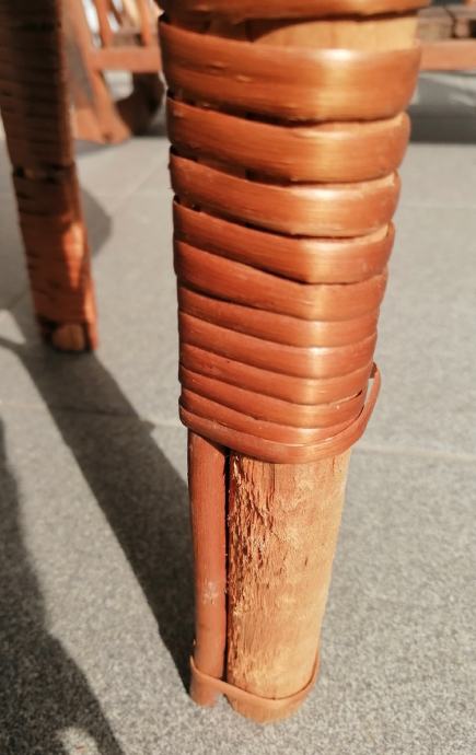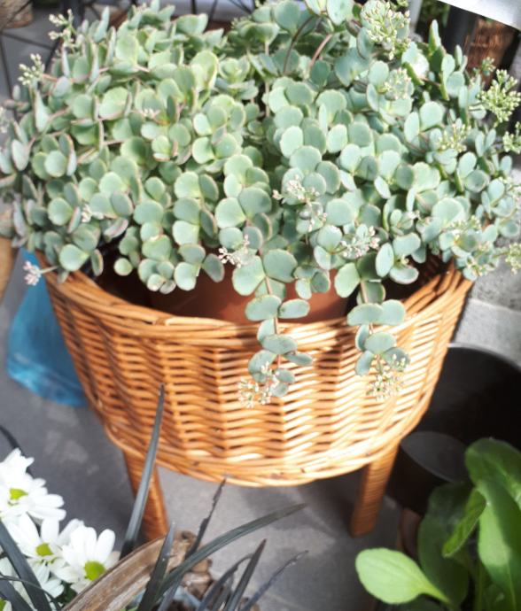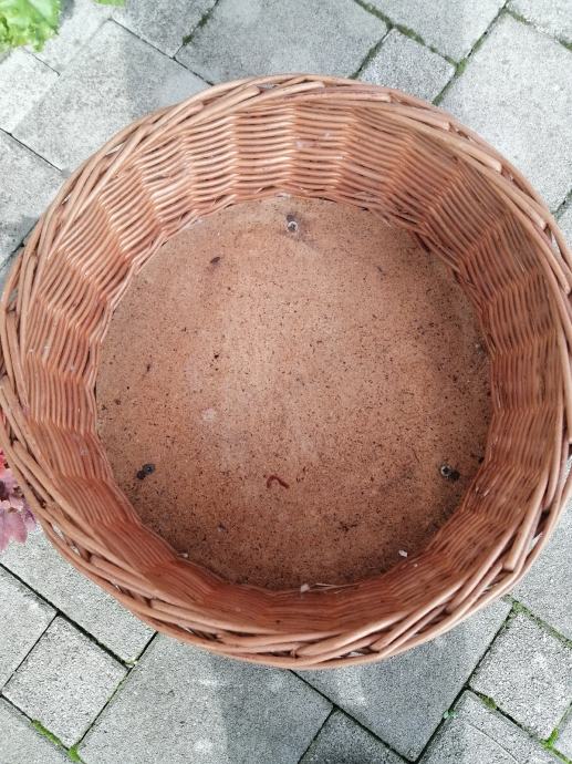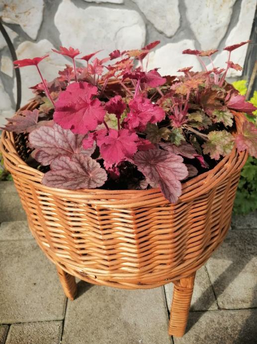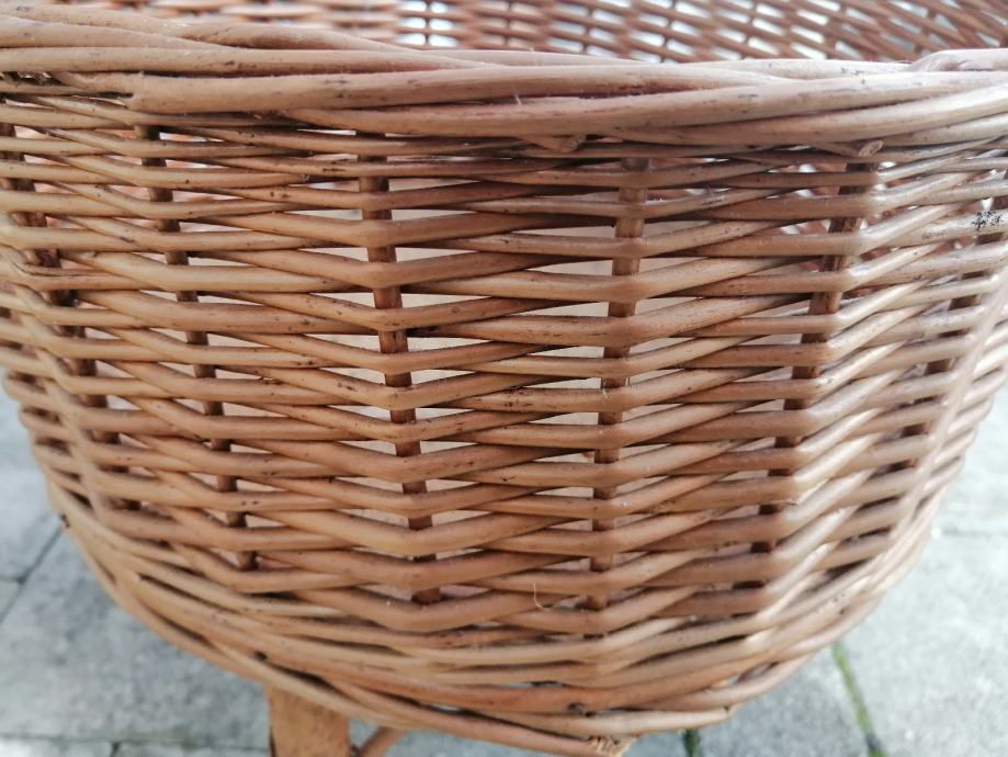 Pleteni okrugli vintage stalak za biljke / cvijeće, očuvan osim na jednoj od nogica što je vidljivo na fotografiji.