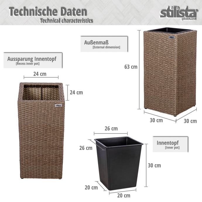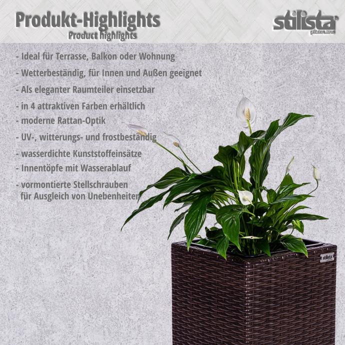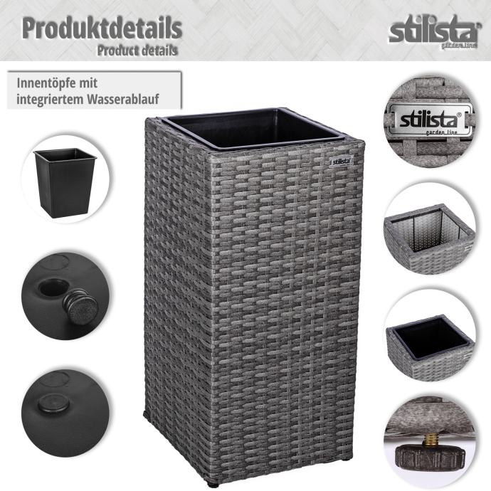 Naše prekrasne STILISTA stupne posude za cvijeće sastoje se od okvira od ratana i posude koja se može ukloniti. Izrađena od izdržljivog i vodoodbojnog poliratana, ova je žardinjera prednost za unutarnju i vanjsku upotrebu. Posude za biljke imaju plastične posude s odvodom za vodu koji se može ponovno zatvoriti, što sprječava da vaše biljke i cvijeće budu natopljeni vodom. Posuda za cvijeće dostupna je u crnoj, krem, smeđoj i sivoj boji.