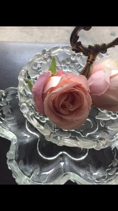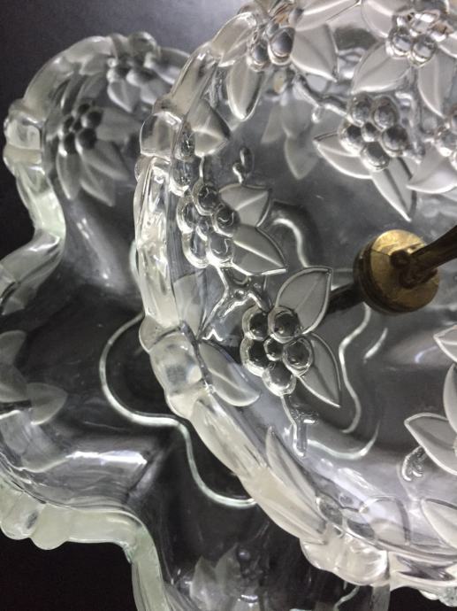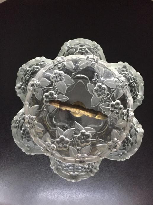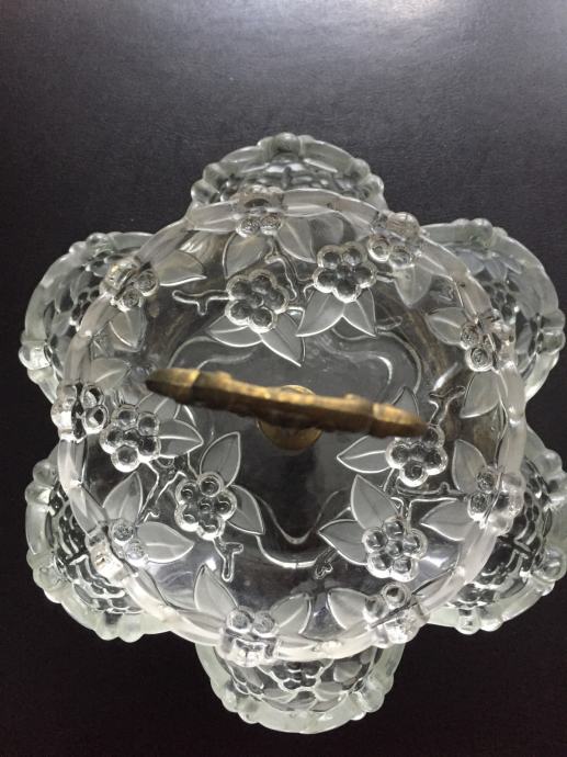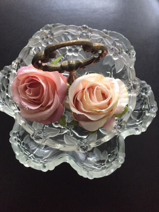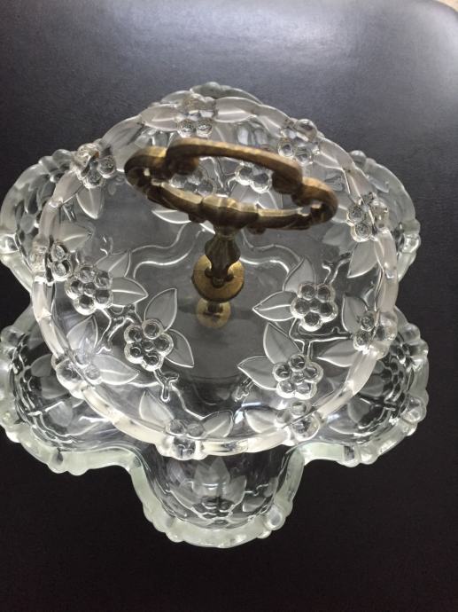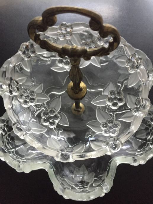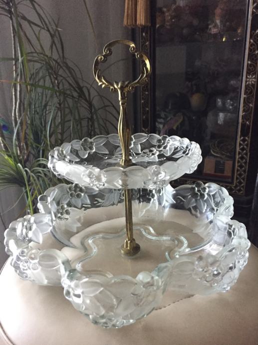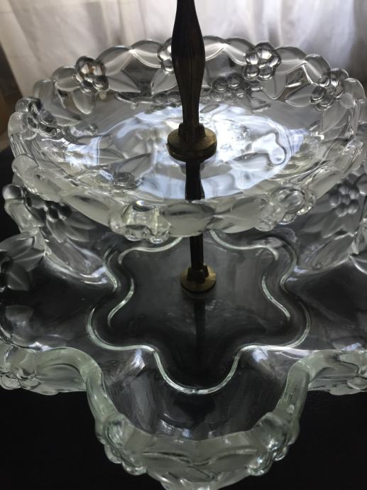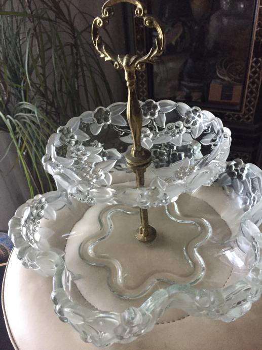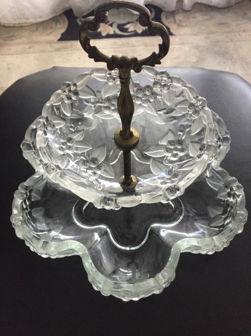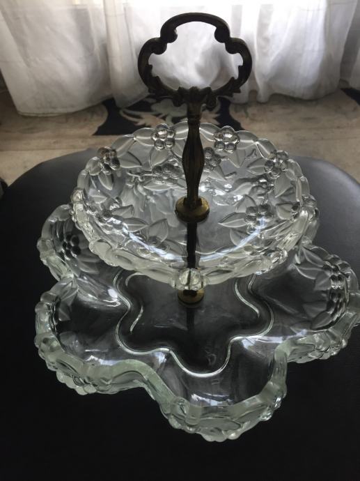 Efektna i vrlo zanimljivog dizajna voćarica frutijera staklena zdjela za voće slatkiše cvijeće na kat sa bakrenim izrezbarenim stalkom..vintage!