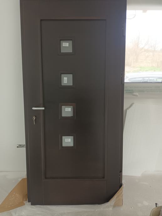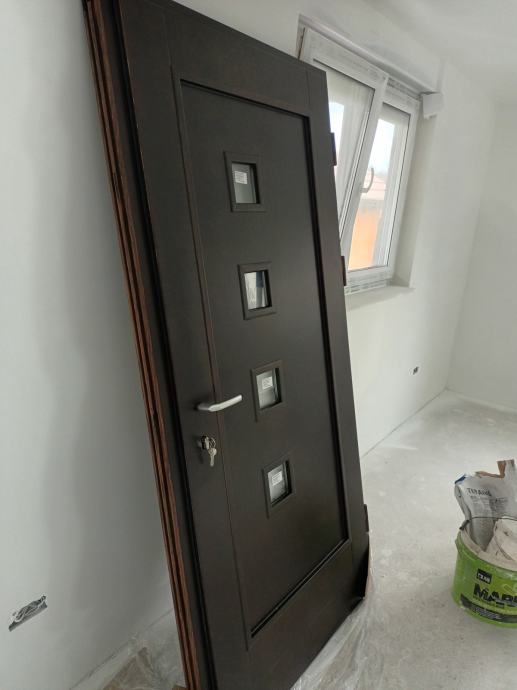 Prodajem nova drvena masivna ulazna vrata dim 1020mmx2100 debljine 68 mm sa 4 staklene kocke.