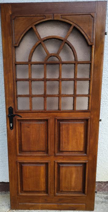 Prodajem kvalitetna masivna drvena vrata s ukrasnim staklenim gornjim dijelom u rustikalnom stilu. Vrata su dimenzija 197 cm visine i 90 cm širine – isključivo krilo, bez štoka.