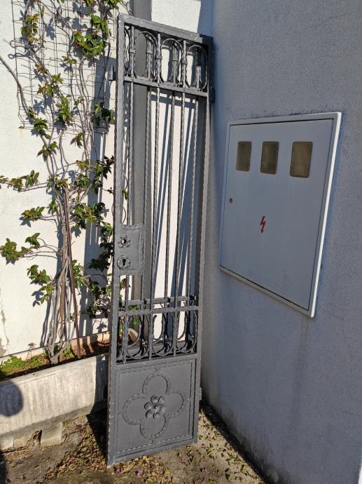 Prodajem rabljena dvorišna vrata izrađena od kovanog željeza, tamno sive boje. Vrata su bogato ukrašena, s vertikalnim šipkama, ukrasnim elementima na vrhu i donjim punim panelom s cvjetnim motivom. Sa strane se nalaze šarke i brava. Dolaze bez okvira.